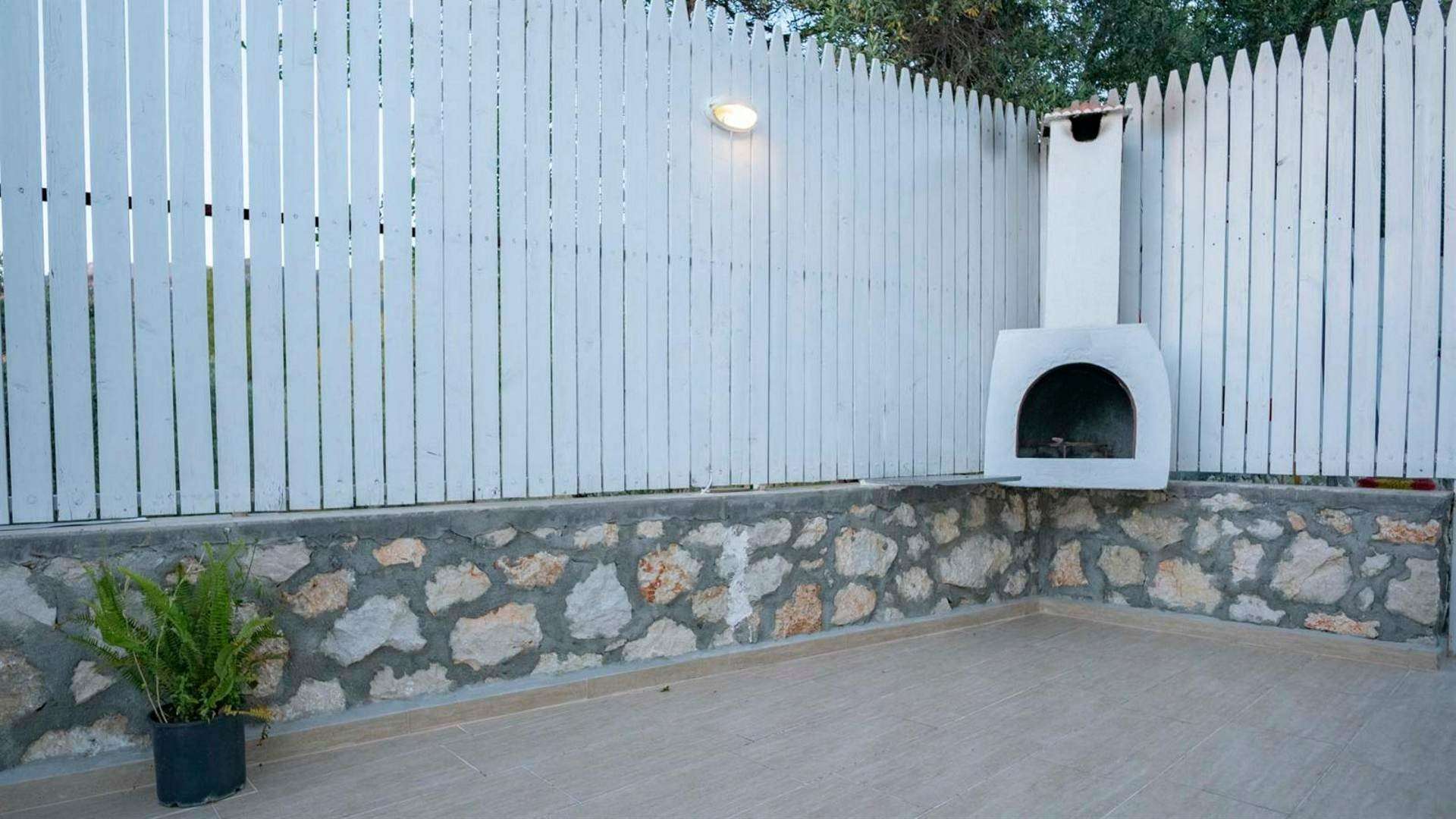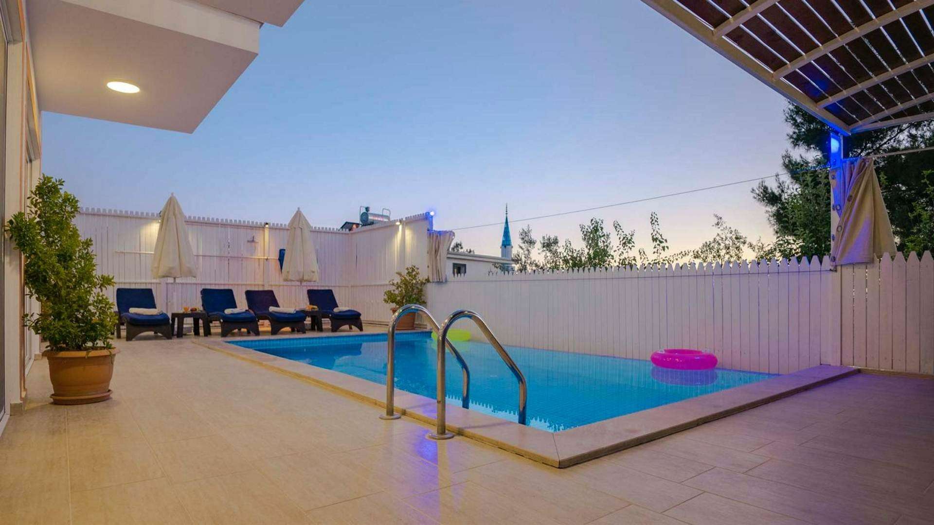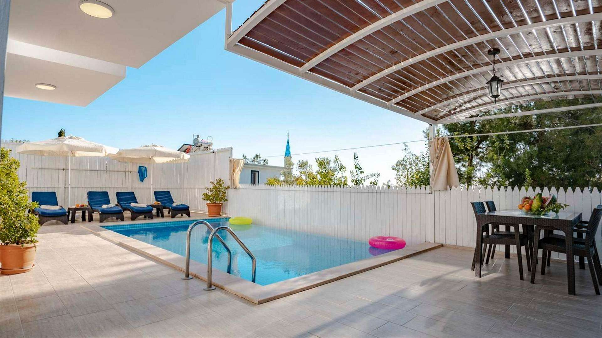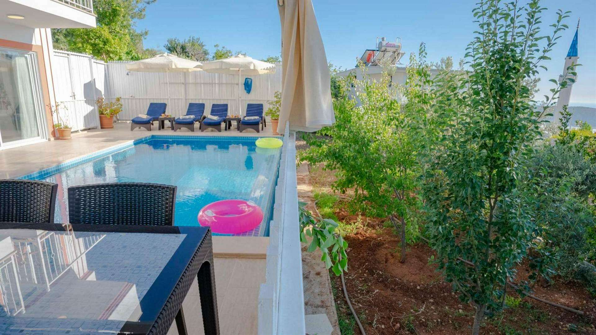 Korunaklı yüzme havuzu, şezlong, şemsiye, yemek masası, bahçe oturma grubu, barbekü bulunmaktadır.