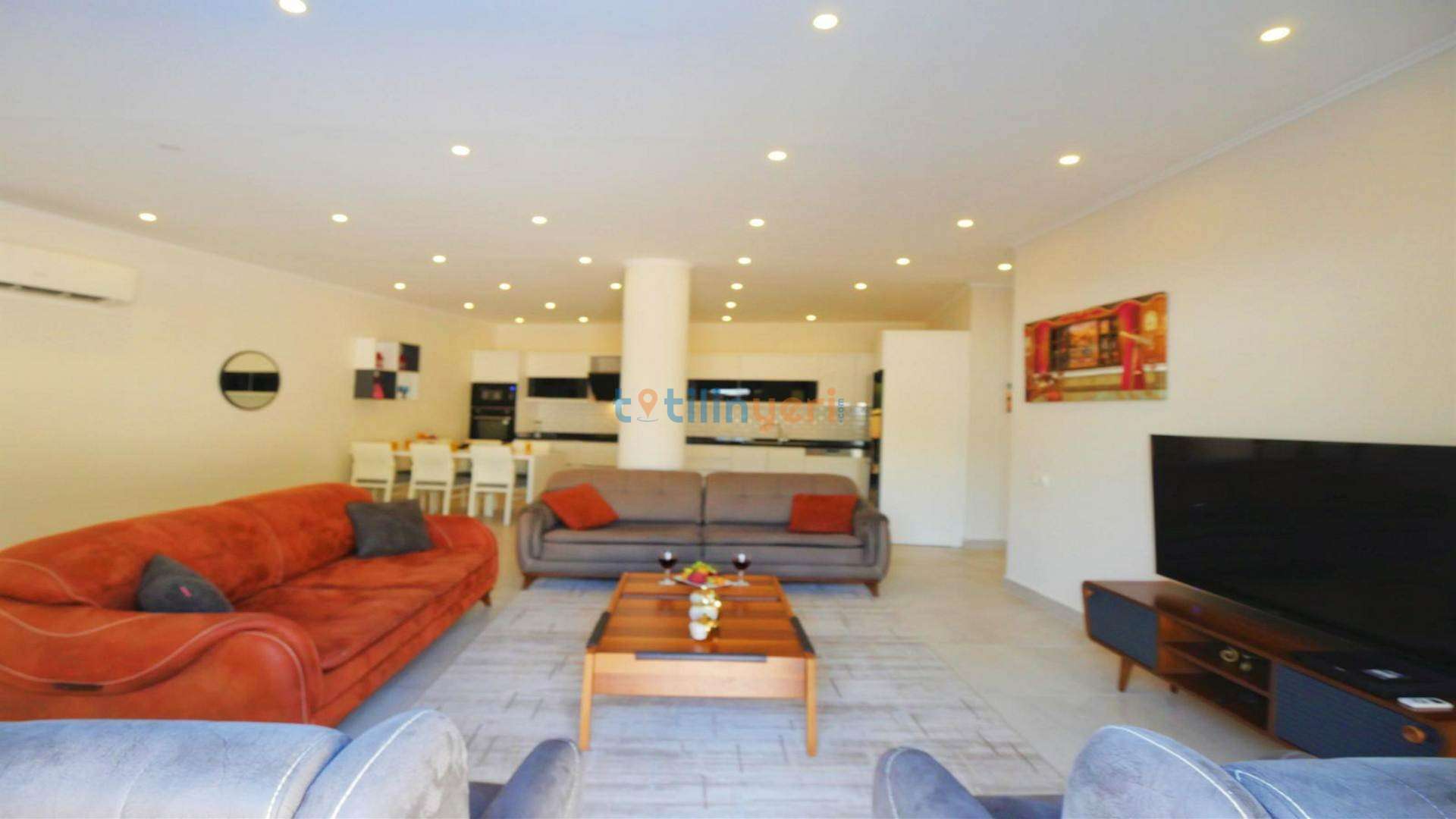 Doğa manzaralı salon içerisinde, koltuk takımı, orta sehpa, TV, TV ünitesi, klima, uydu alıcısı yer almaktadır.