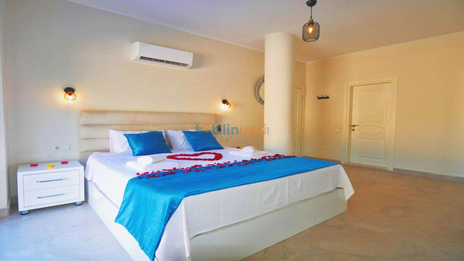 Yatak odası içerisinde, 1 adet çift kişilik yatak, klima, elbise dolabı, komodin, makyaj masası, banyo ve tuvalet yer almaktadır.