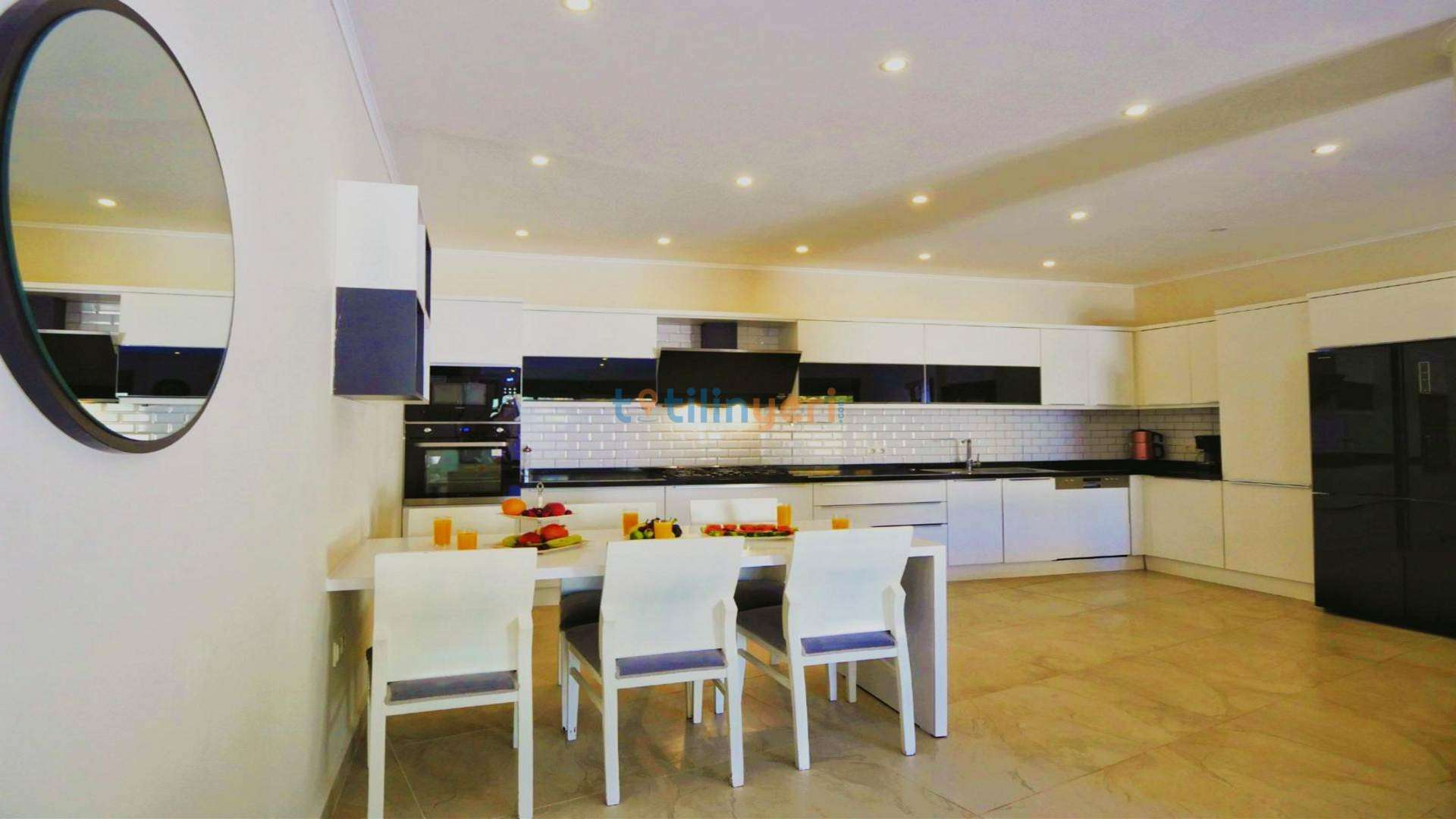 Amerikan mutfak içerisinde, buzdolabı, bulaşık makinası, çamaşır makinası, yemek masası, yemek takımı, ankastre fırın, mikrodalga fırın, tost makinası, ankastre ocak, çaydanlık, su ısıtıcısı, tava, tencere takımı ve gerekli olan tüm mutfak gereçleri yer almaktadır.