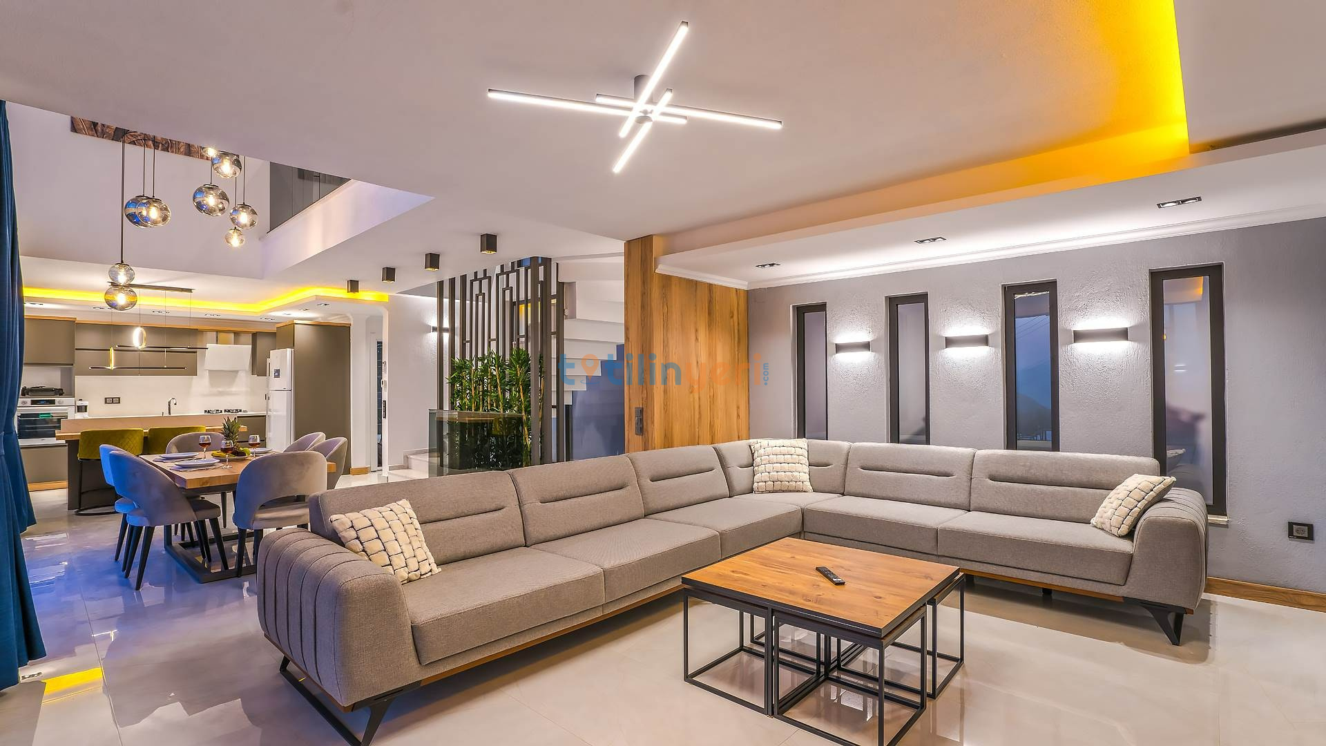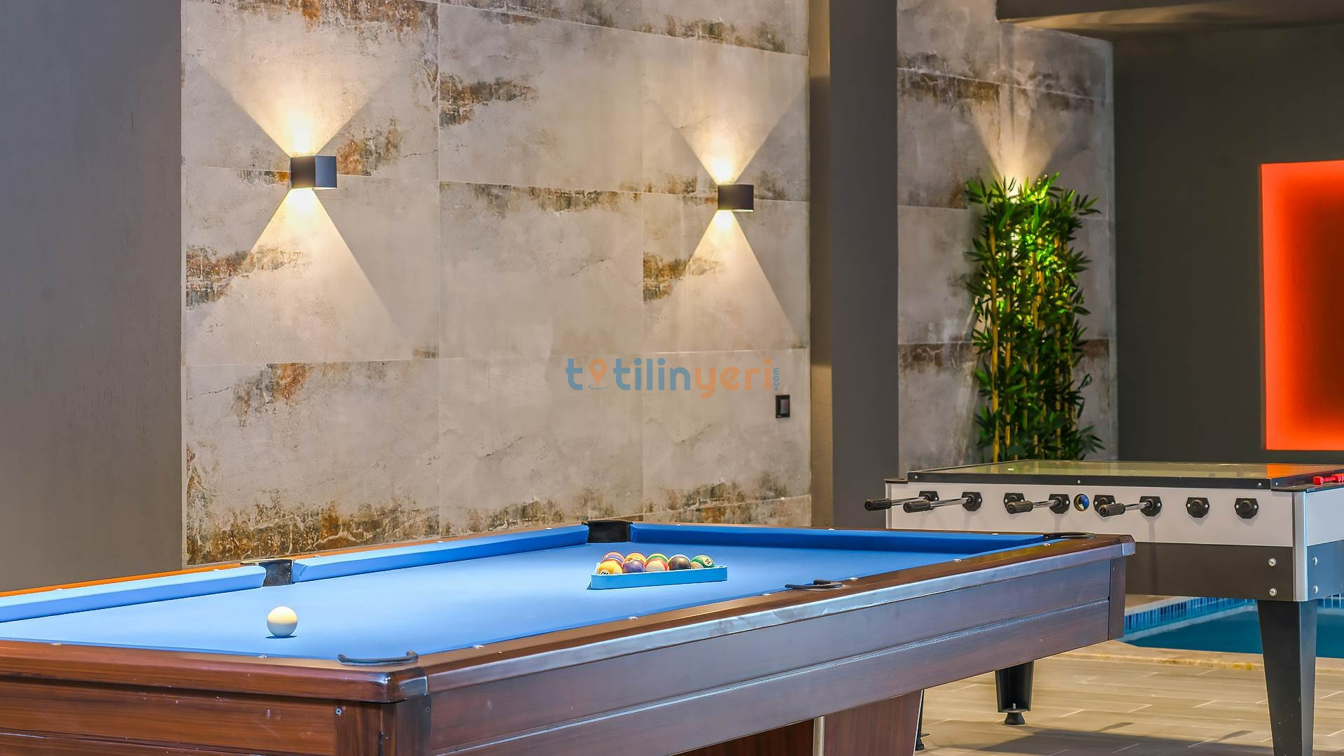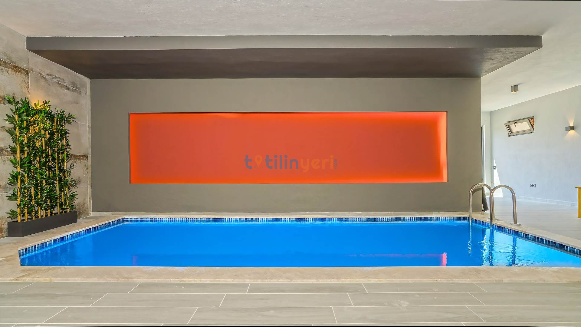 Salon : Modern dekore edilmiş salon içerisinde rahat oturma grubu, TV, klima yer almaktadır. Salondan havuz terasına geçiş vardır.