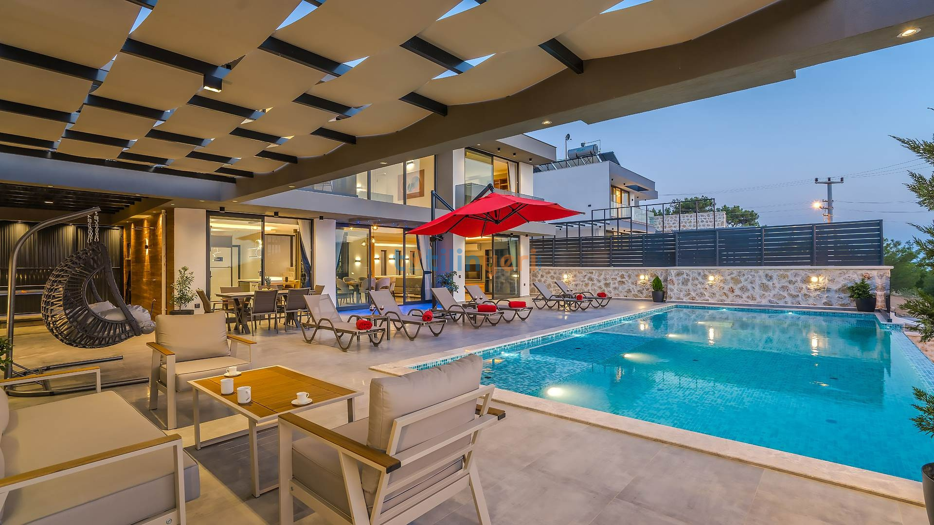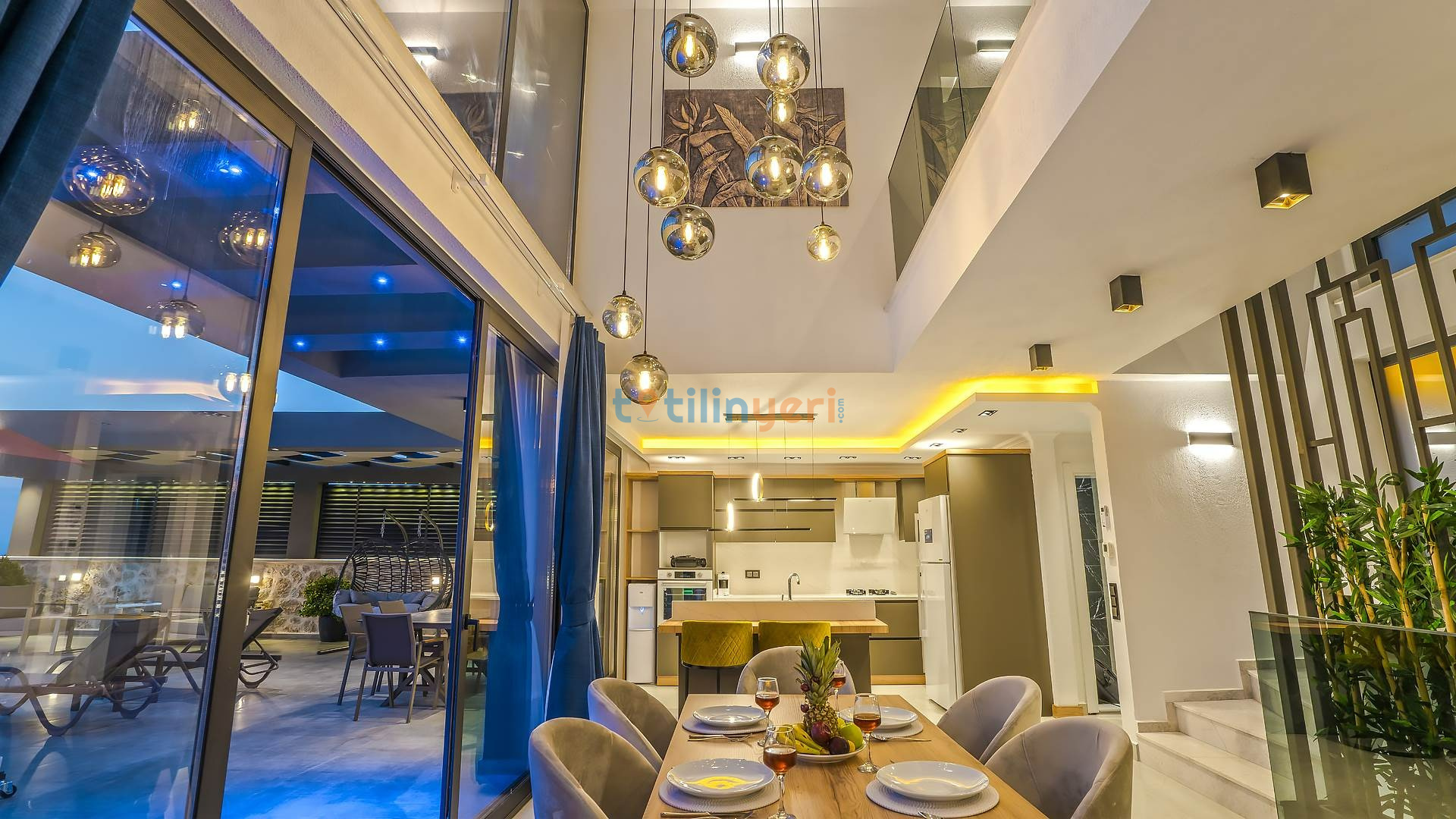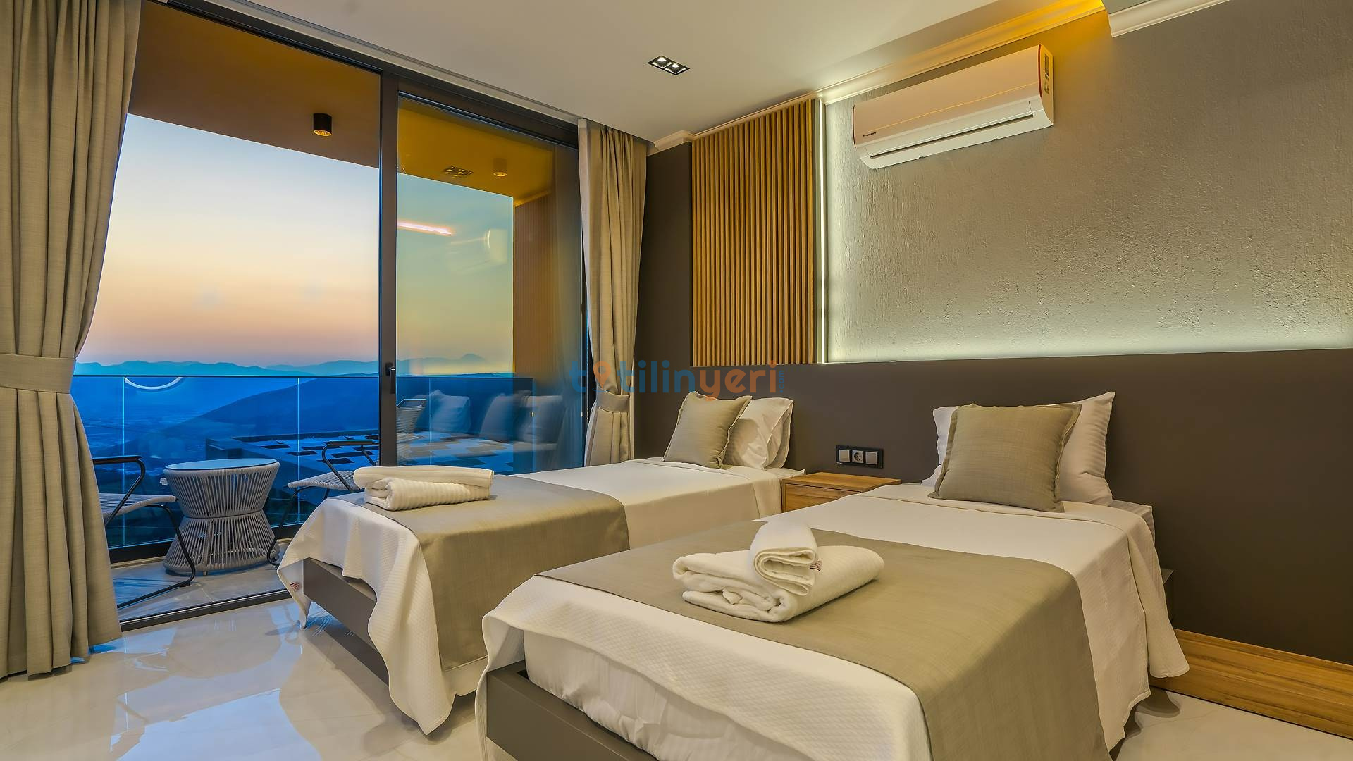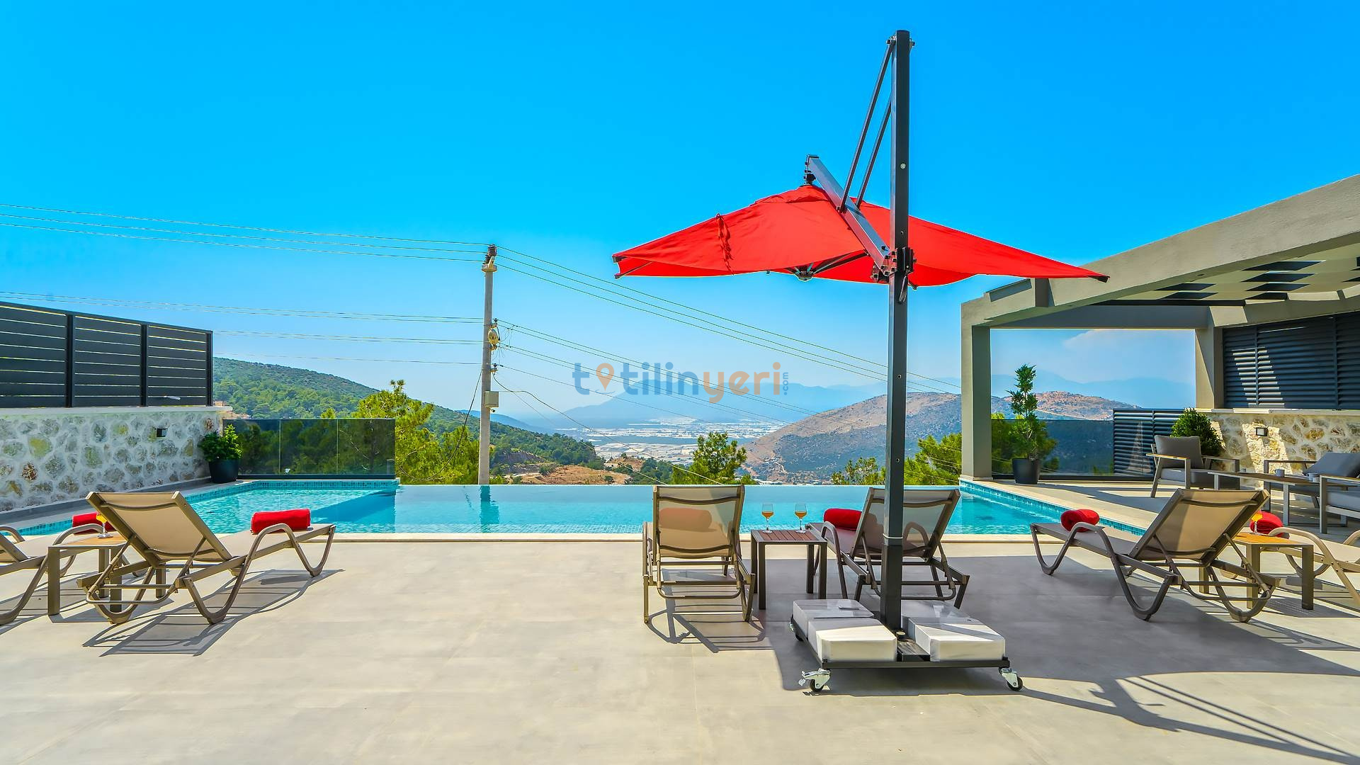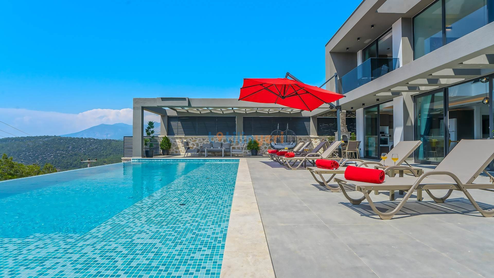 Kalkan Akbel bölgesinde yer alan modern mimarili villamız 3 yatak odalı ve 6 kişilik konaklama kapasitesine sahiptir. Villamızın geniş ve doğa manzaralı bahçesinde havuz, şezlong, güneş şemsiyeleri, oturma köşesi, salıncak ve yemek masası yer almaktadır. Bunun yanı sıra konforlu bir tatil geçirebilmeniz için en kaliteli eşyalar ile dekore edilmiş yatak odalarından birinde jakuzi yer almaktadır. Hamam , sauna , spor aletleri , sinema odası gibi aktiviteler ile tatilinizi daha keyifli hale getirebilirsiniz.