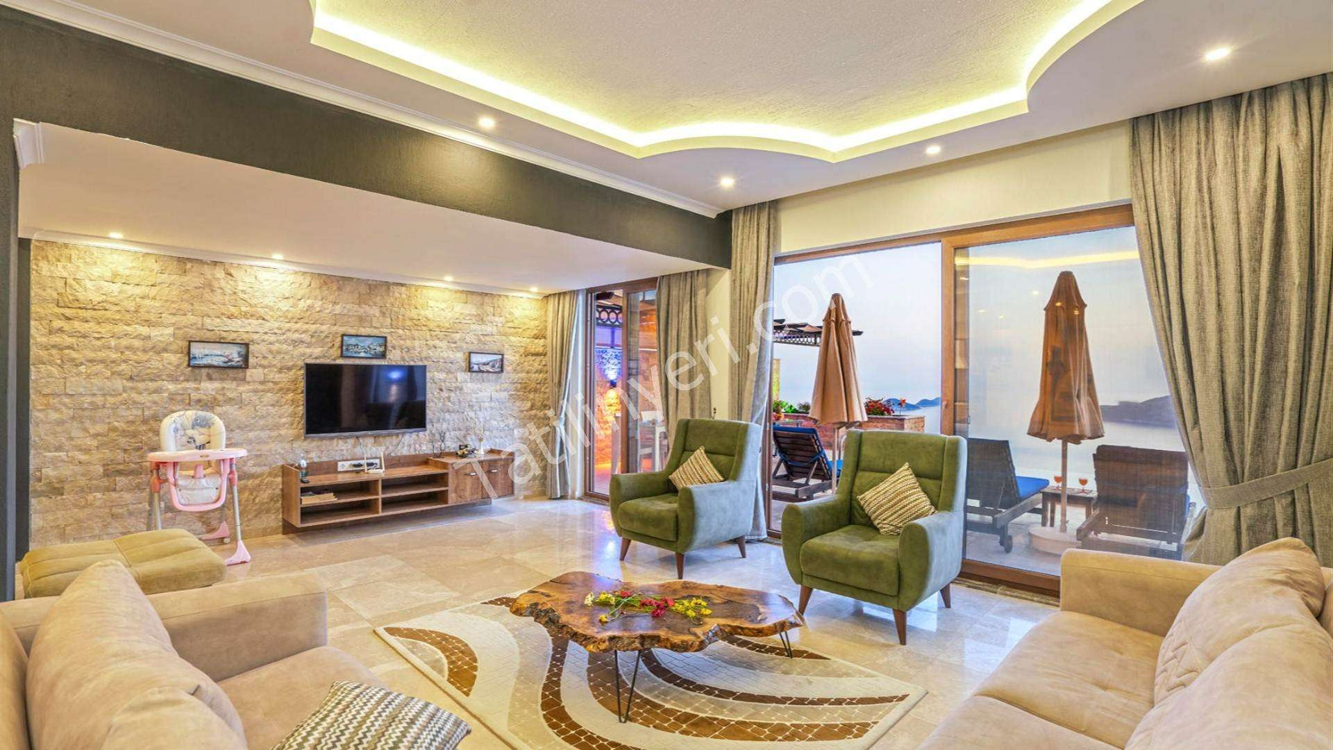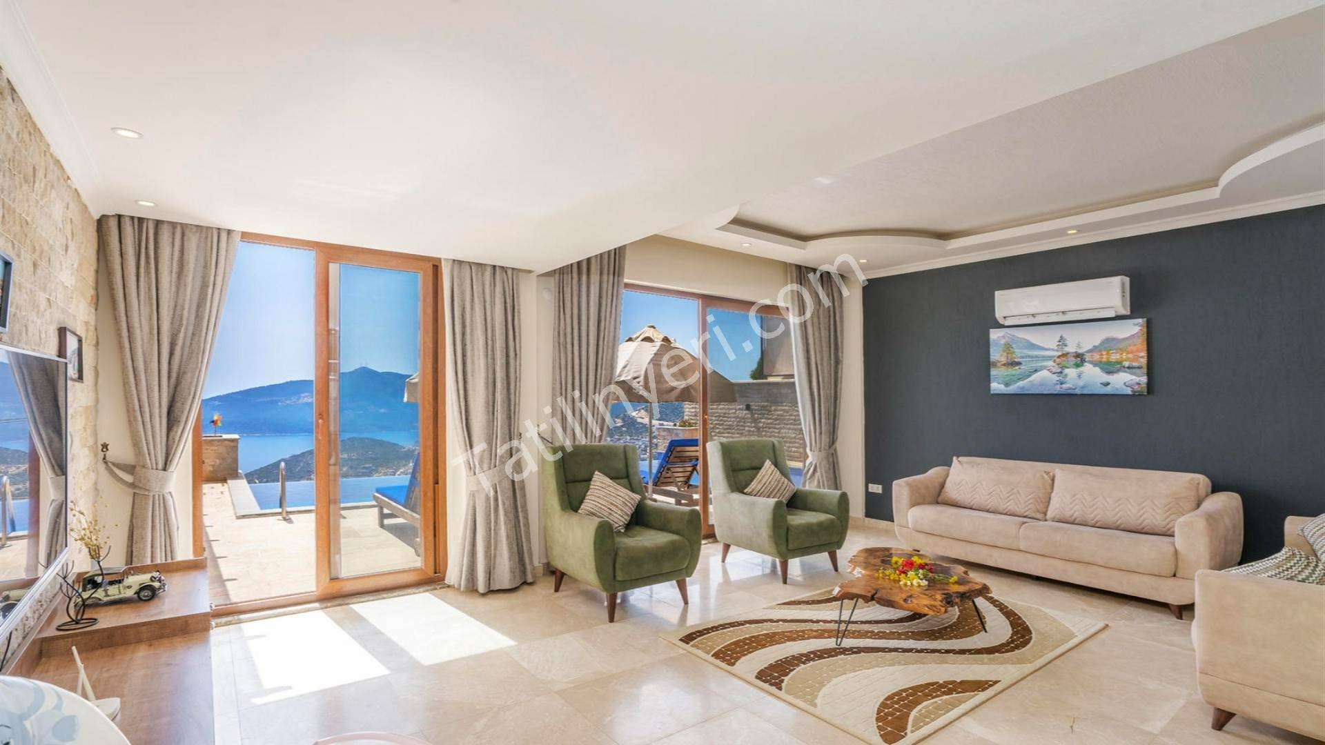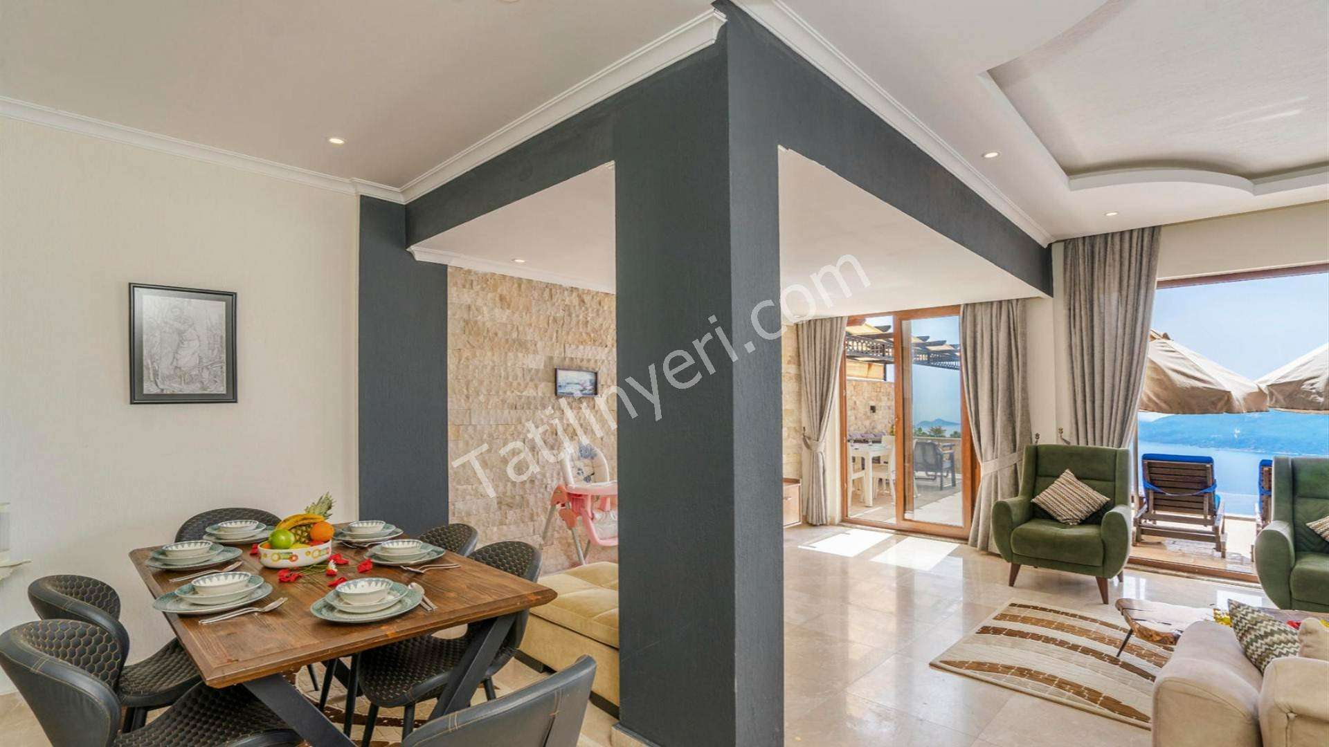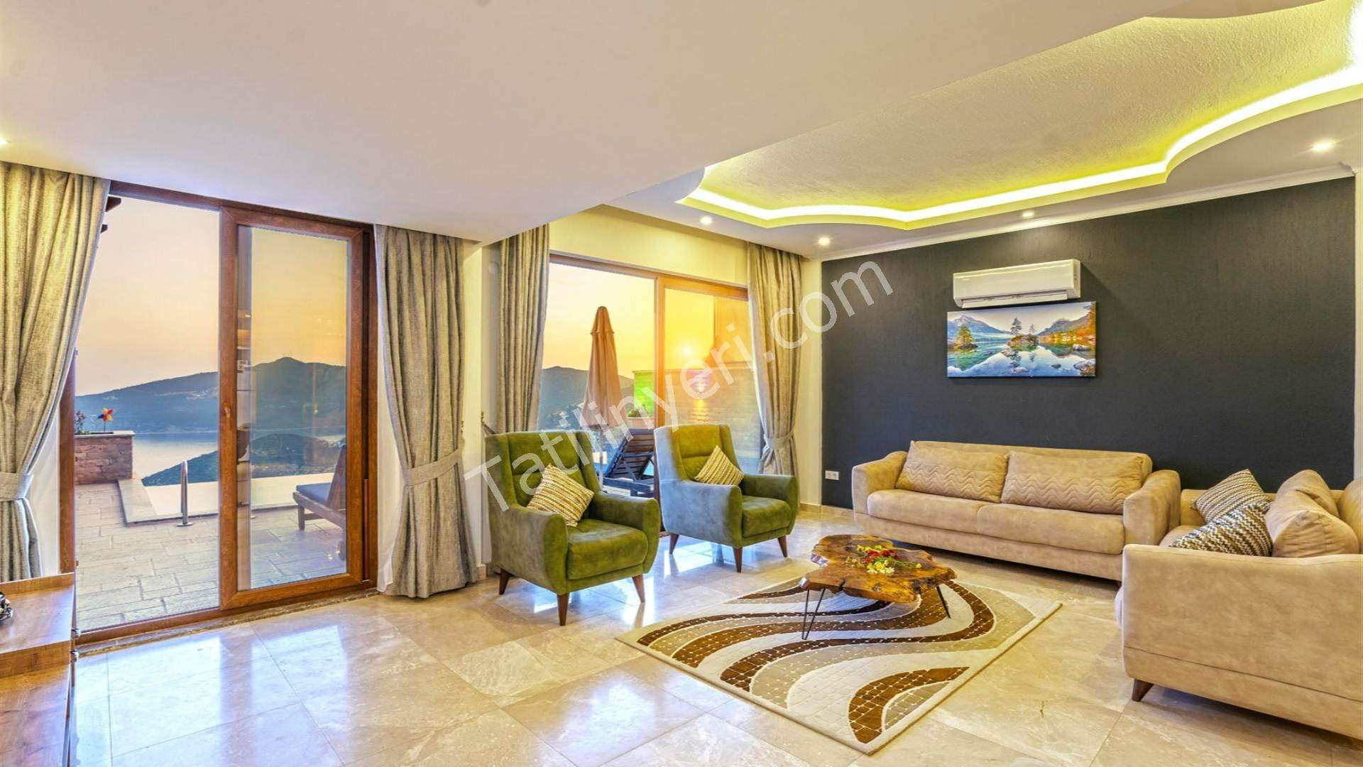 Deniz manzaralı salonunda modern oturma grubu, plazma, televizyon, uydu alıcısı, klima, sehpa ve havuz başına çıkış bulunmaktadır.