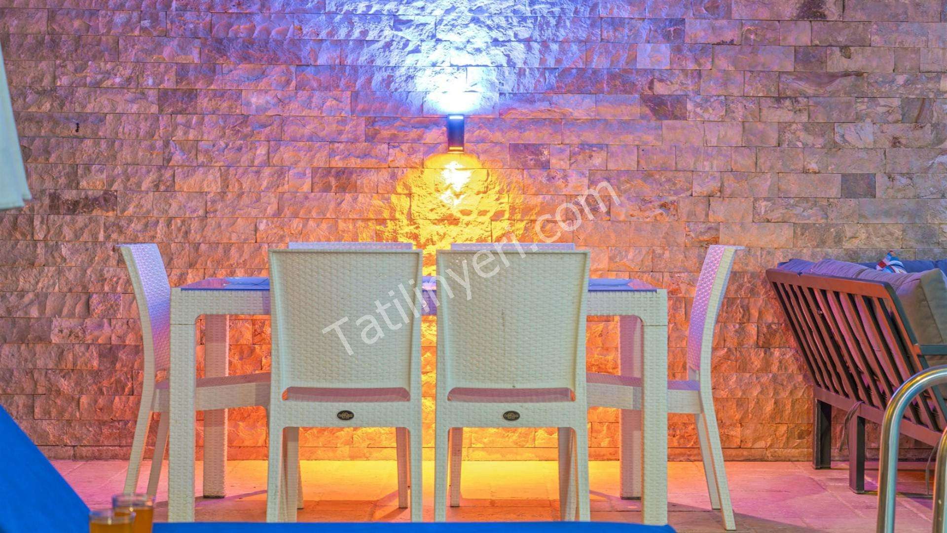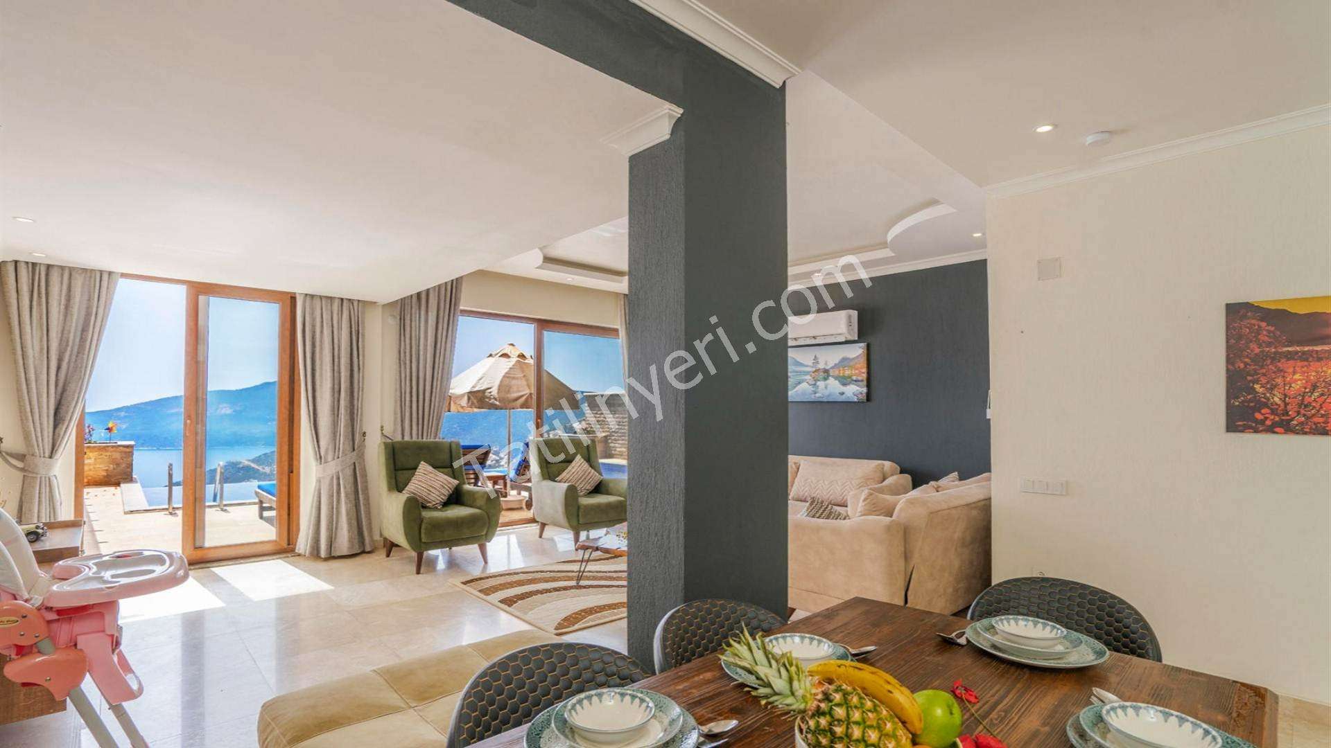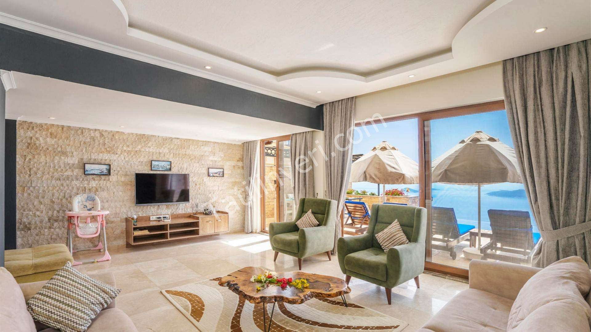 Deniz manzaralı salonunda modern oturma grubu, plazma, televizyon, uydu alıcısı, klima, sehpa ve havuz başına çıkış bulunmaktadır.