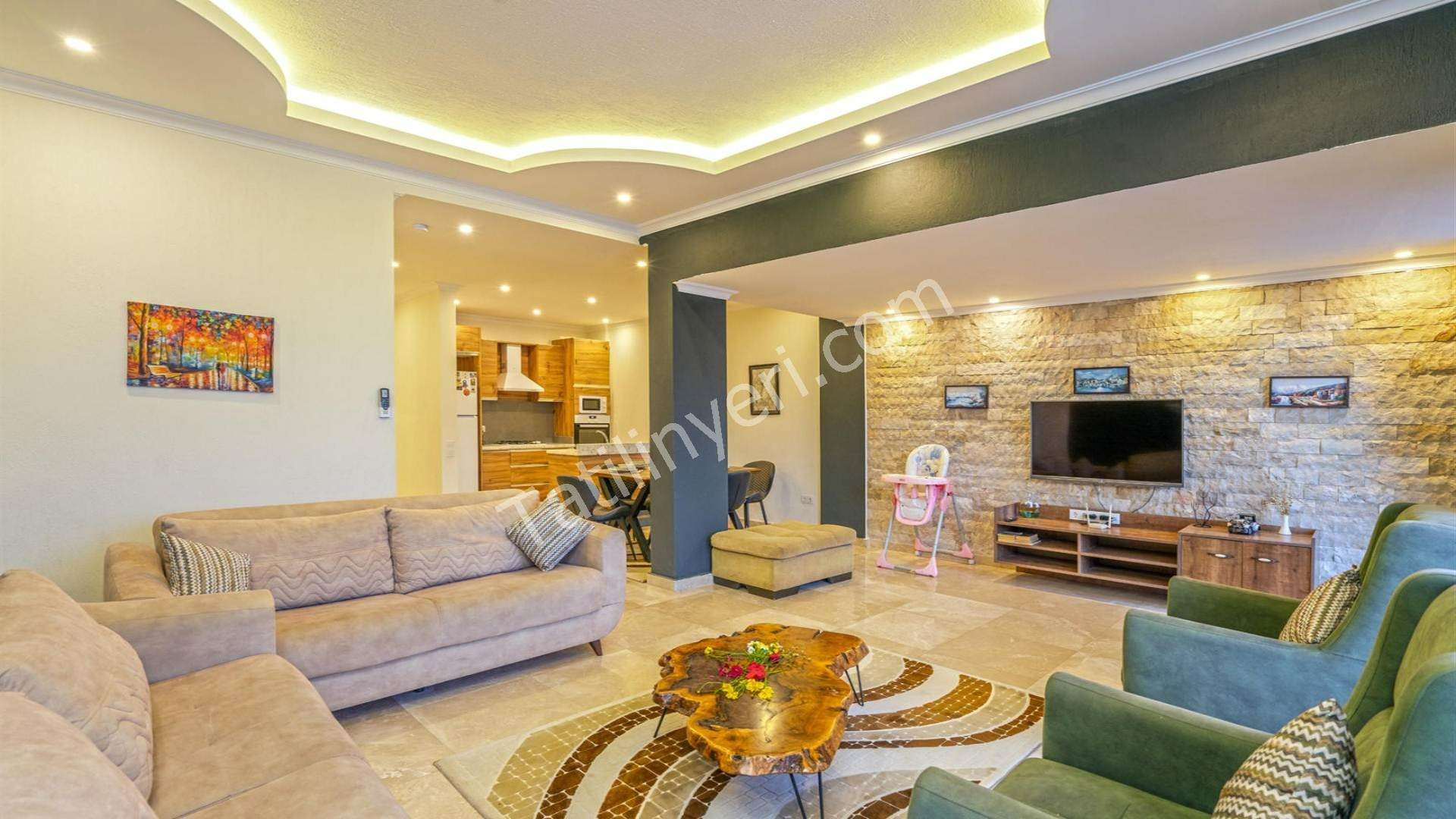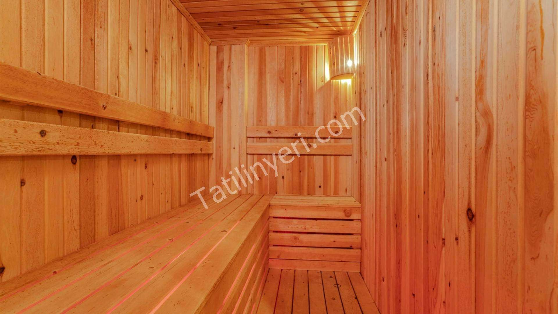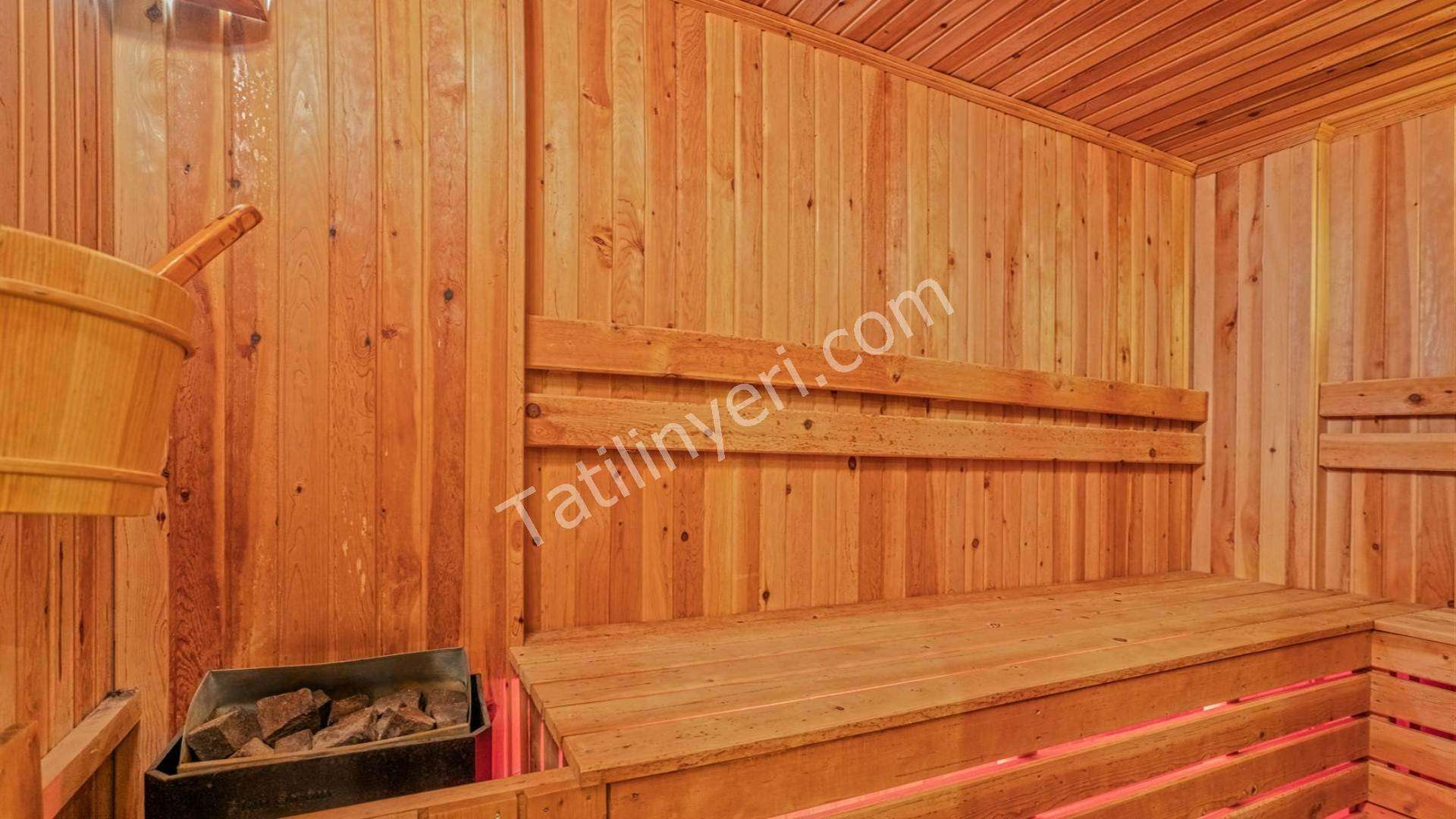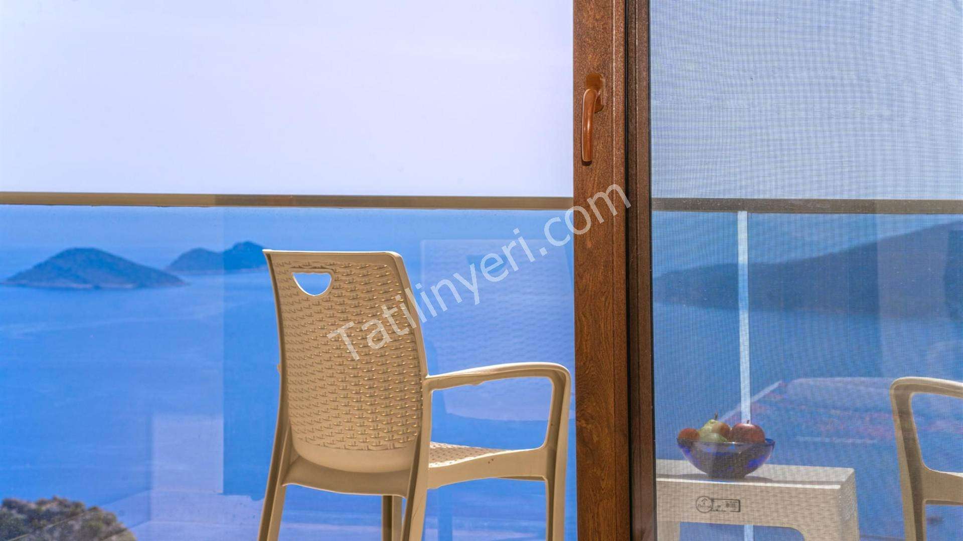Deniz manzaralı salonunda modern oturma grubu, plazma, televizyon, uydu alıcısı, klima, sehpa ve havuz başına çıkış bulunmaktadır.