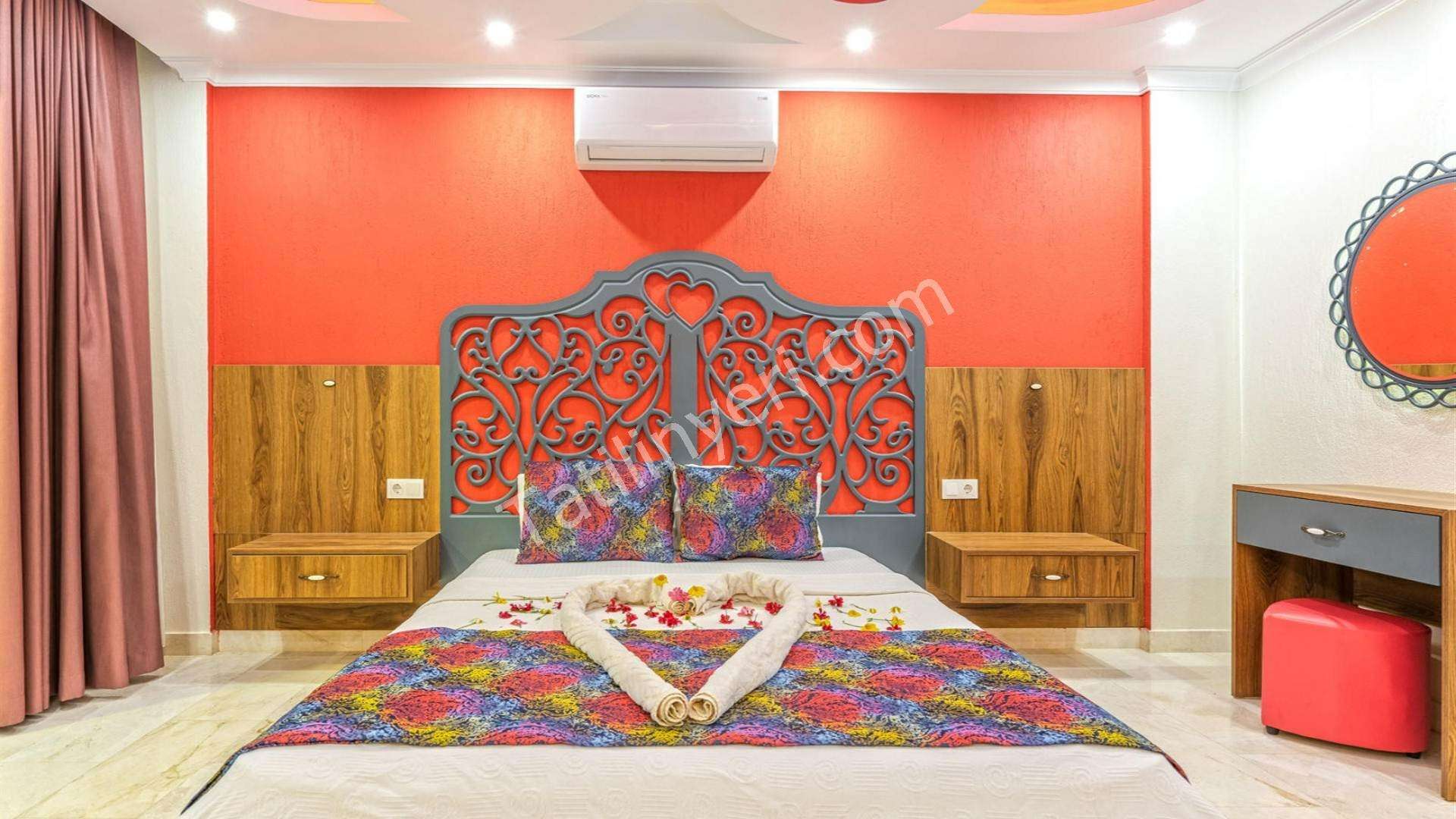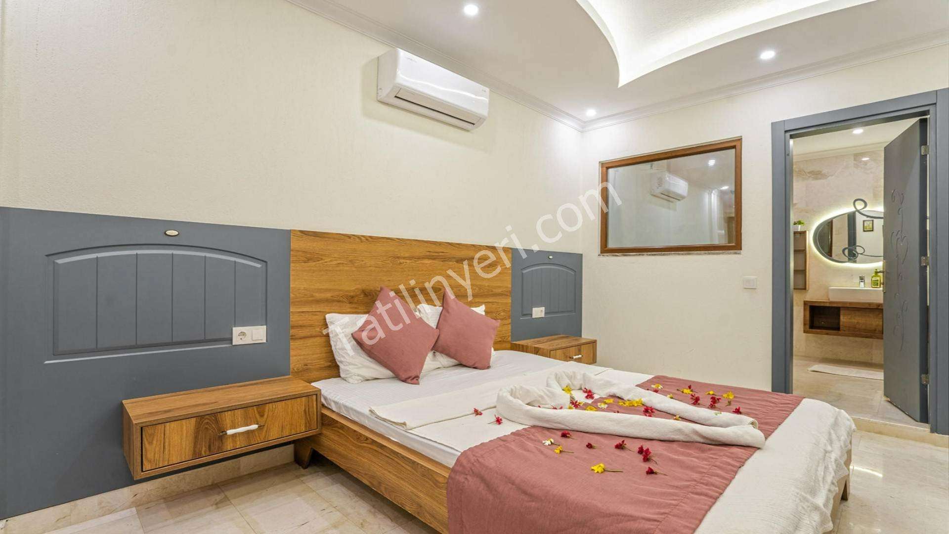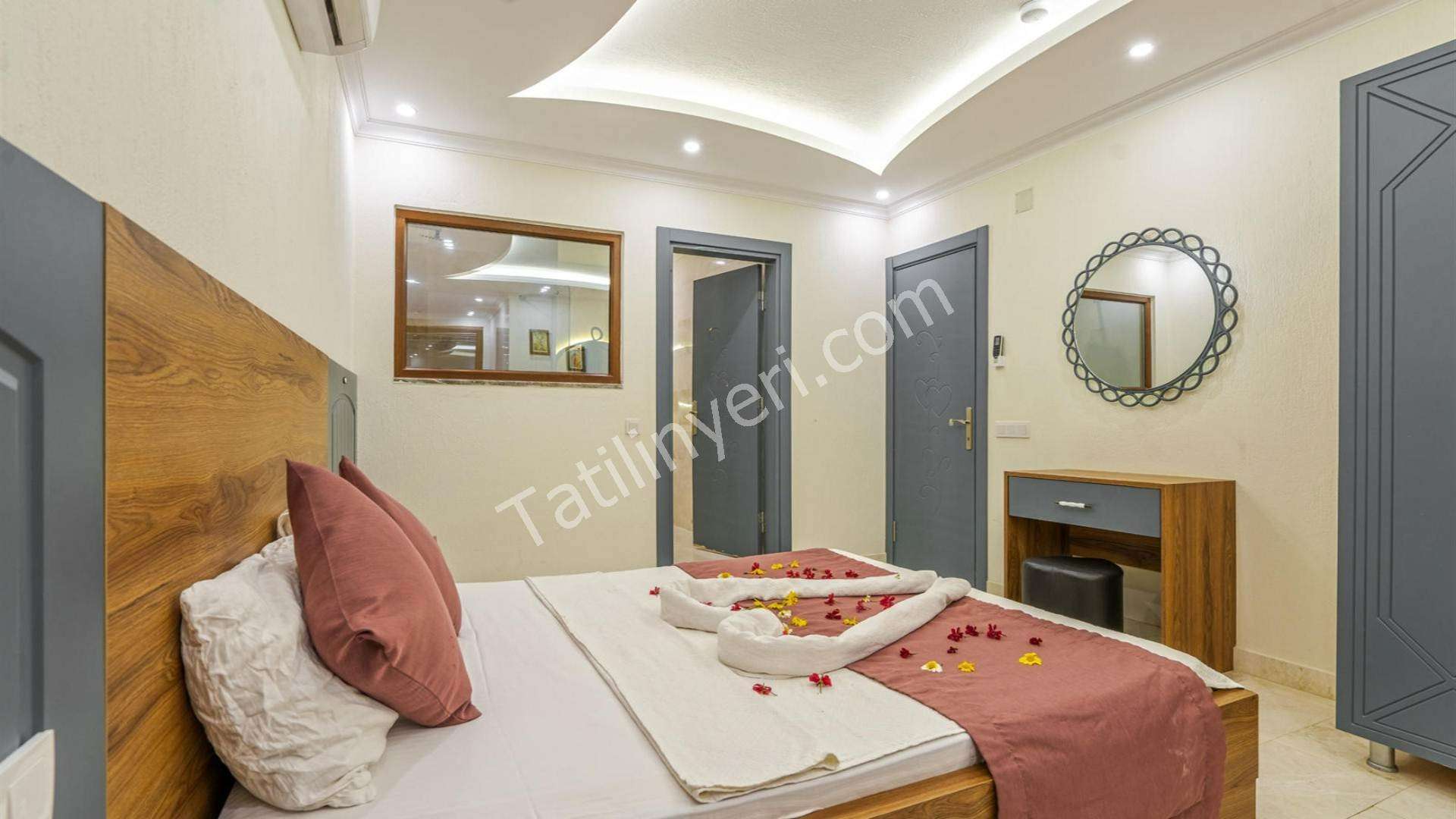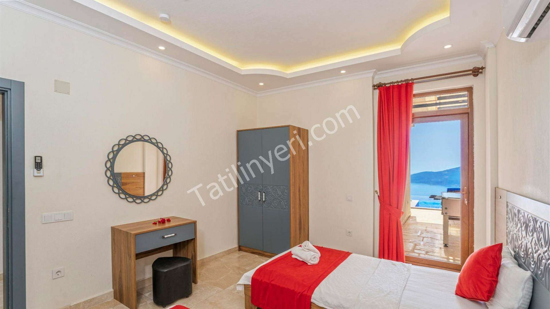 Yatak Odası 2: Deniz manzaralı yatak odasında çift kişilik yatak, komodin, televizyon, klima, elbise dolabı ve banyo tuvalet bulunmaktadır.