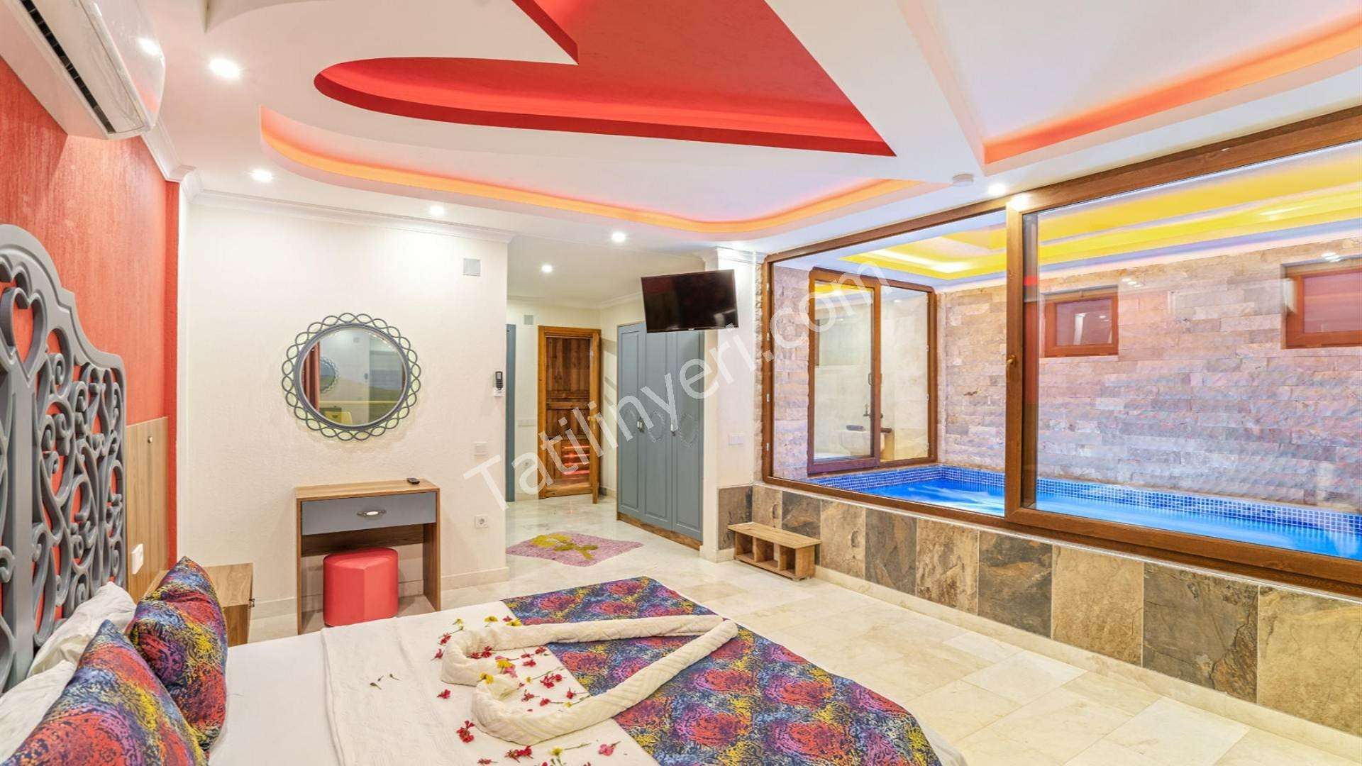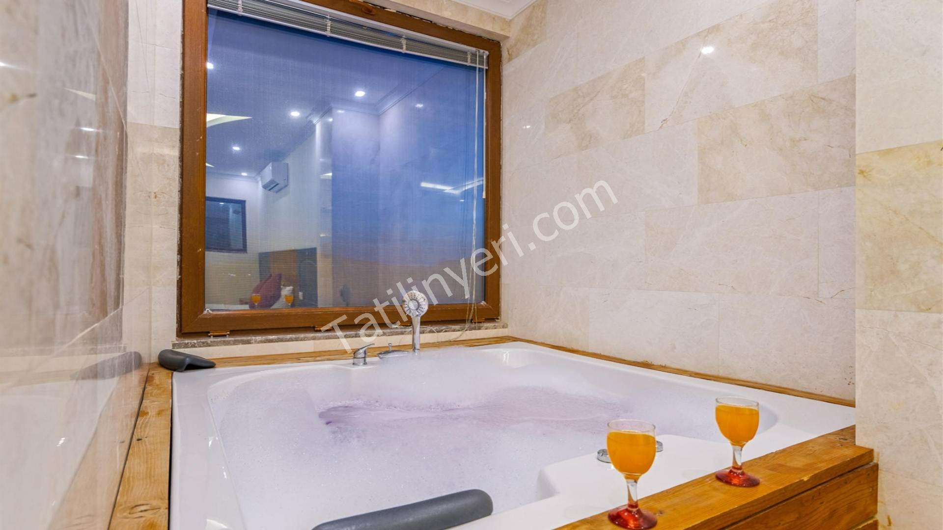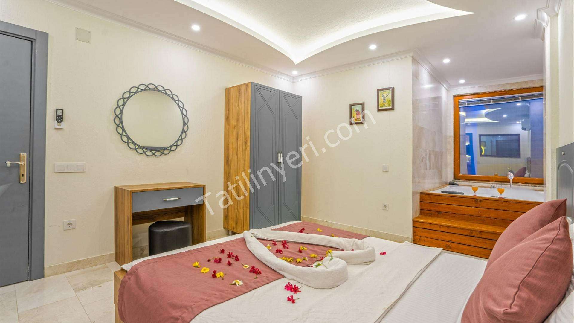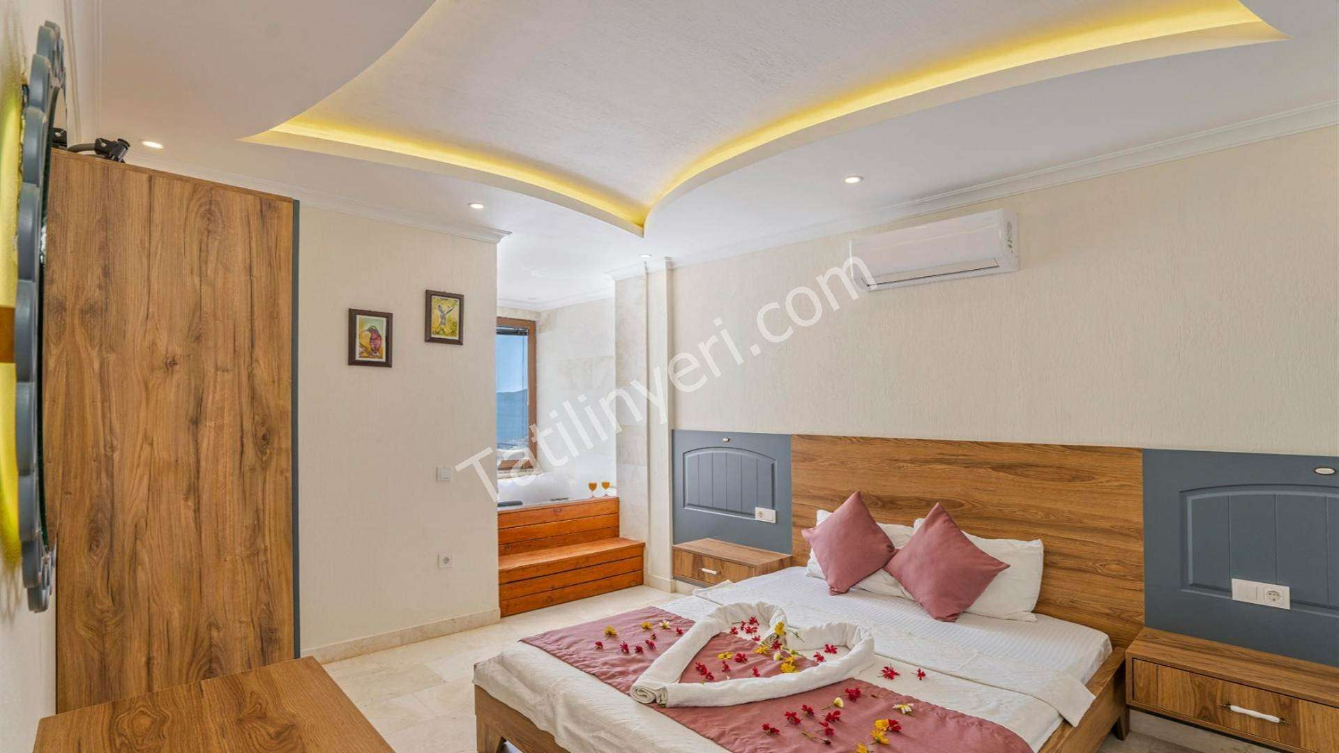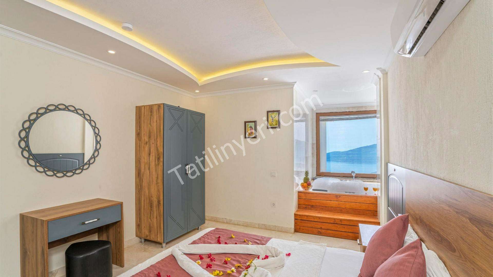 Yatak Odası 1: Deniz manzaralı yatak odasında çift kişilik yatak, televizyon, komodin, klima, elbise dolabı, jakuzi ve banyo tuvalet bulunmaktadır.