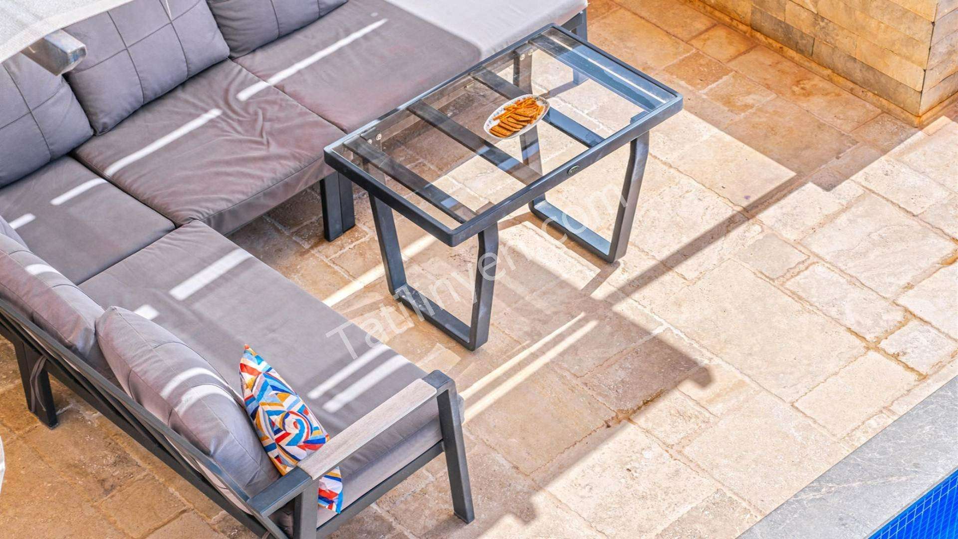 Havuz başında şezlong, şemsiye, mangal, yemek masası ve sandalyeler bulunmaktadır.