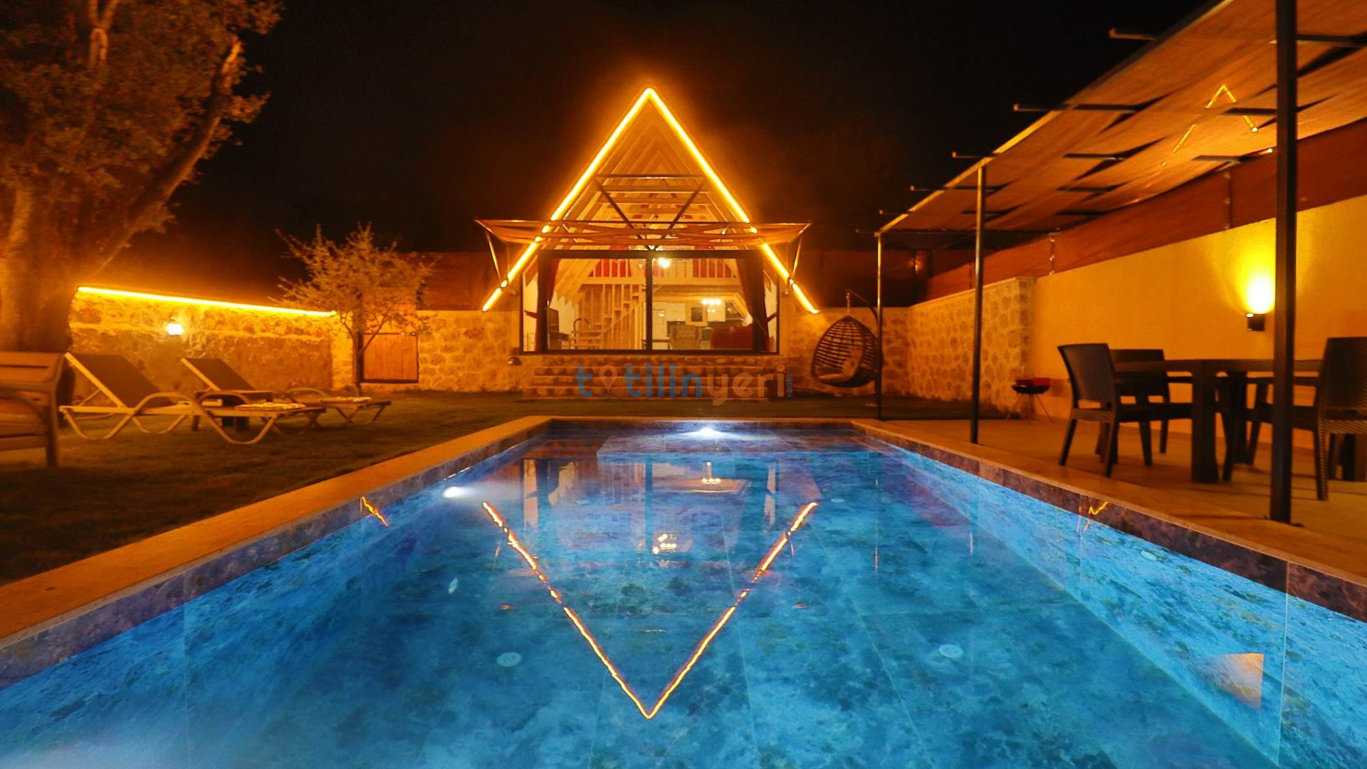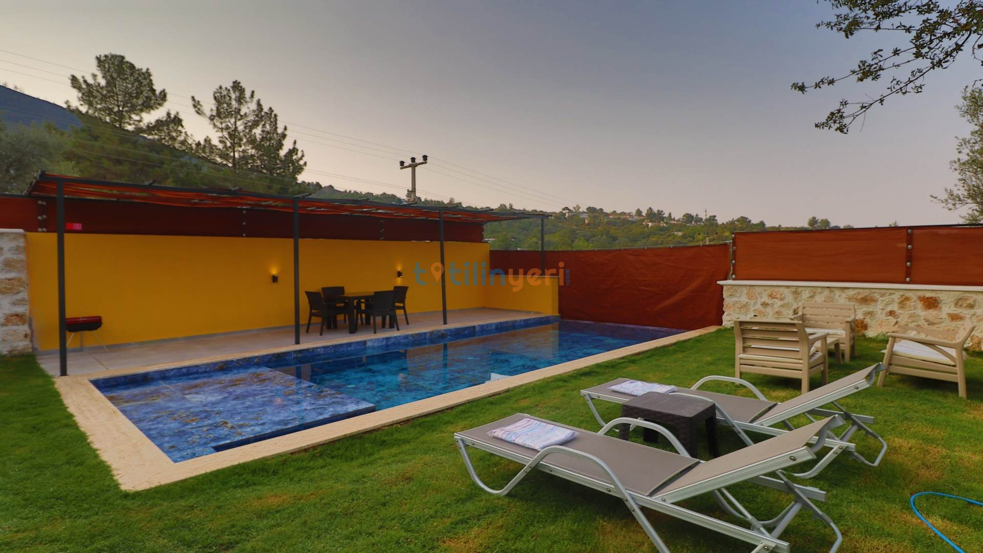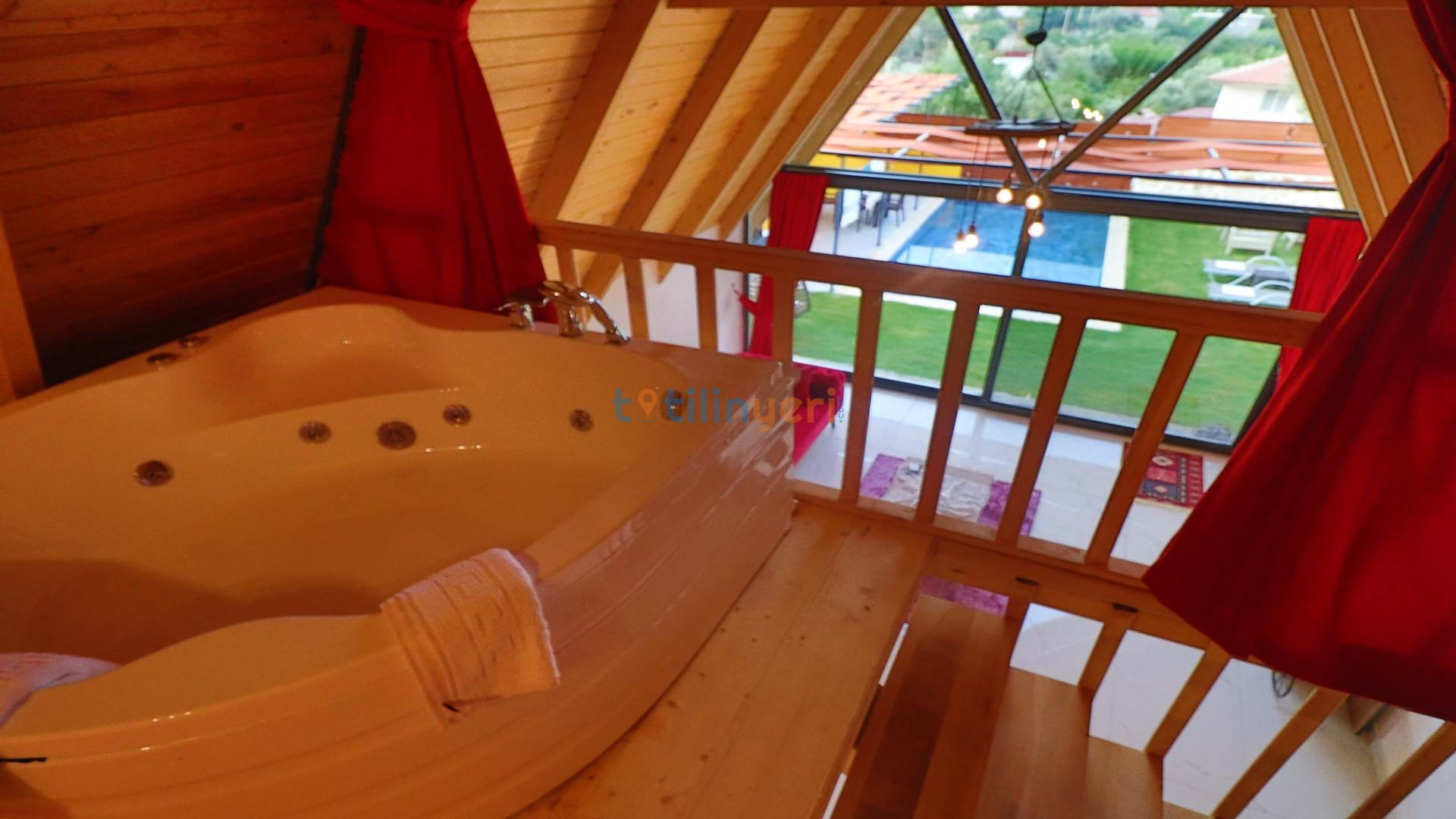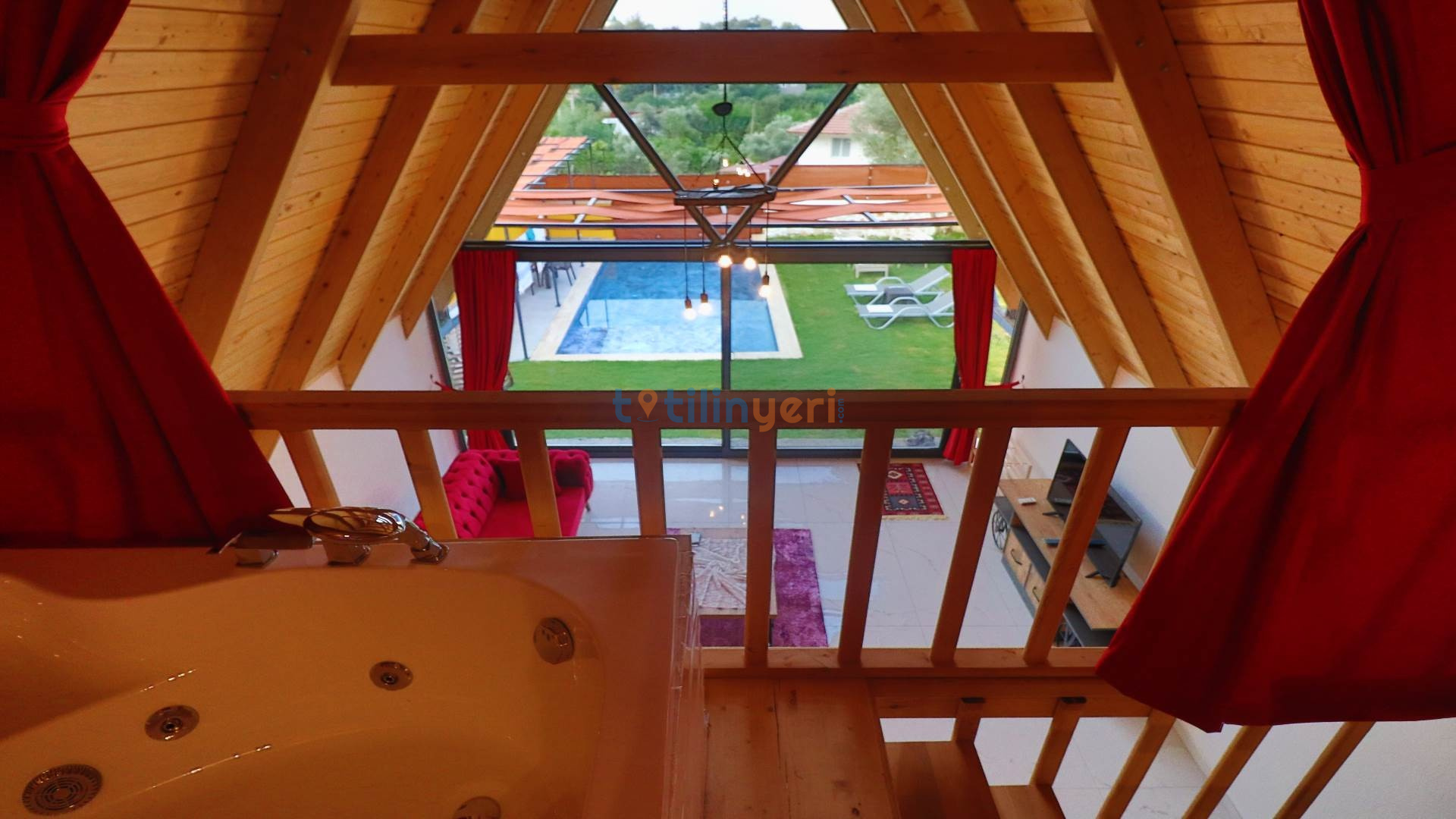 Yatak odasının bulunduğu asma katta jakuzi de bulunan villamızın havuz alanı korunaklıdır.