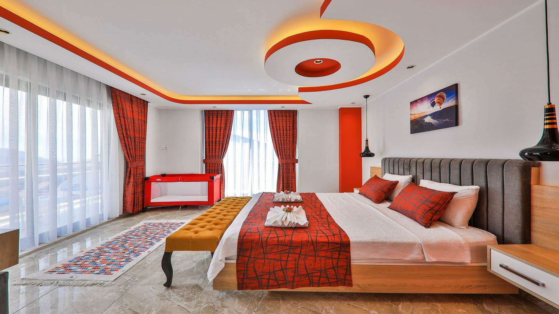 Detayları : Çift kişilik yatak, Makyaj masası, Komodin, Klima, Elbise dolabı, Banyo, Jakuzi , Bebek Yatağı ,Balkon bulunmaktadır.