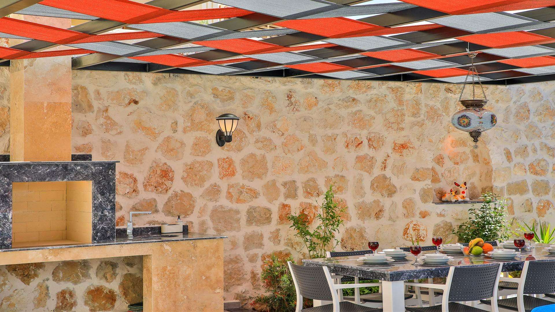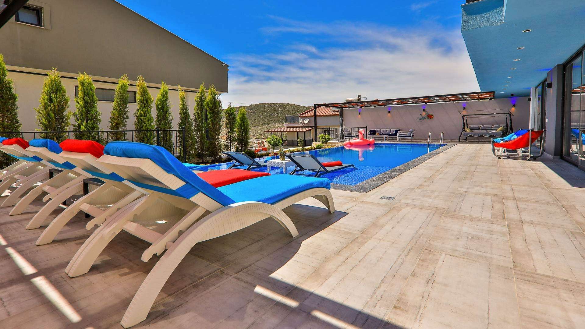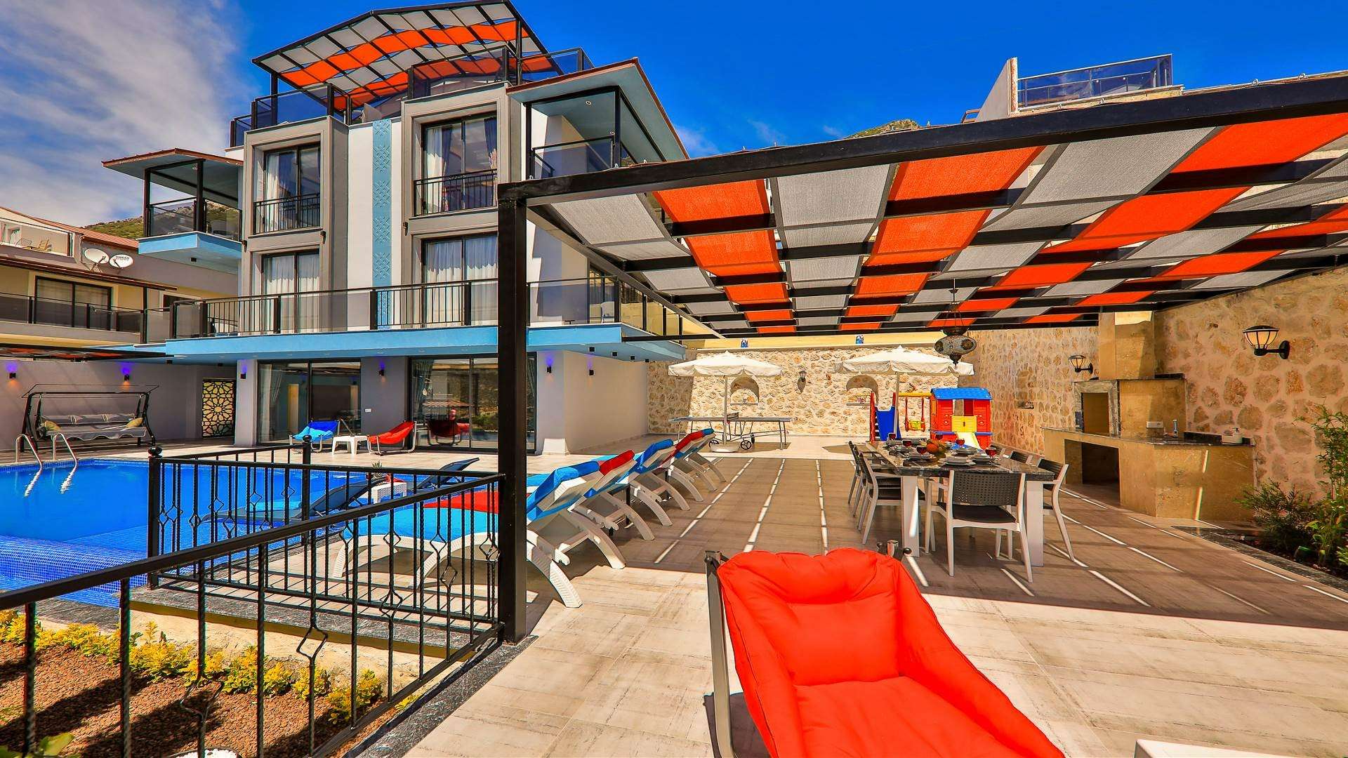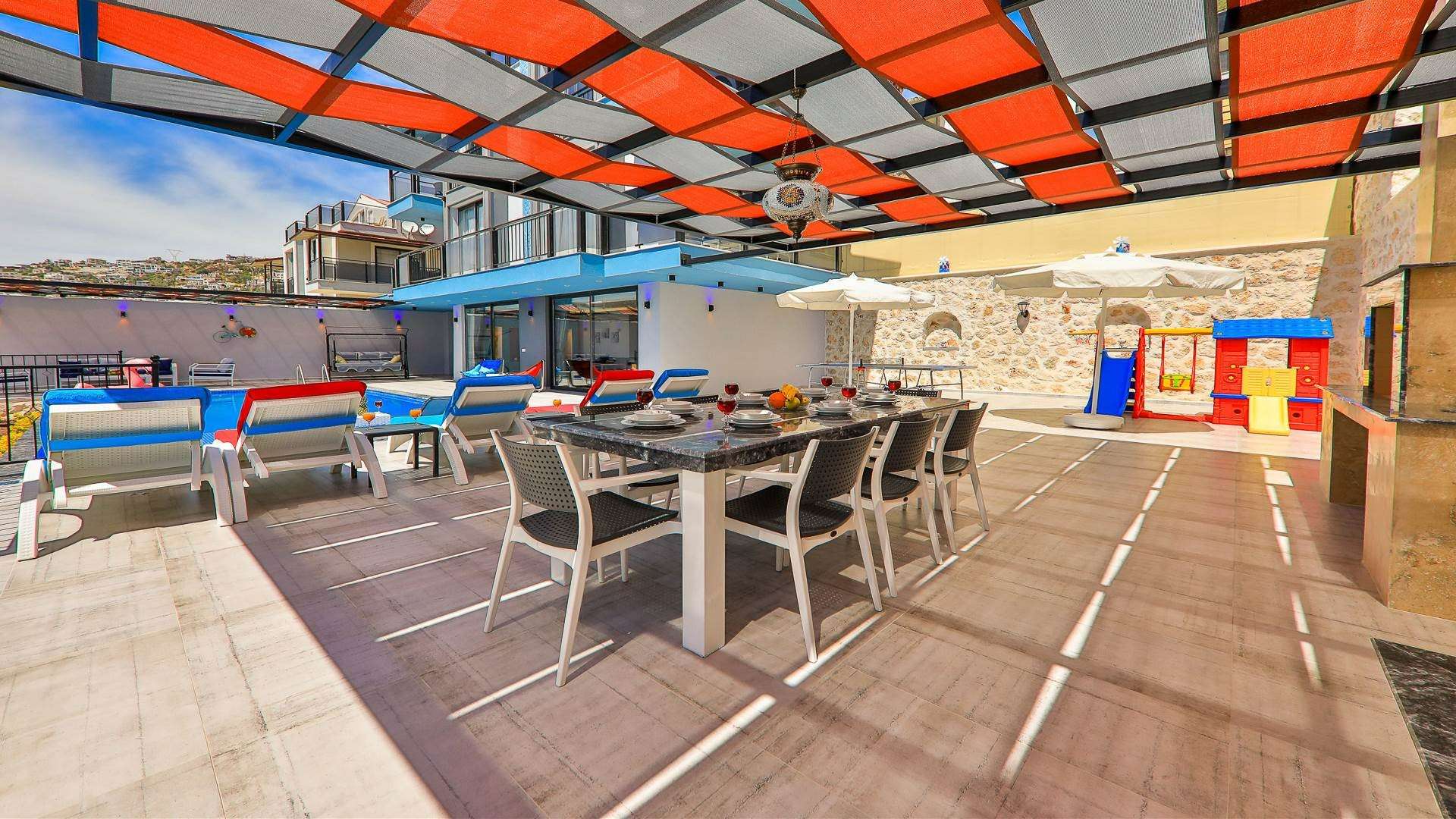 Detayları : 8 Kişilik masa ve sandalye, Şezlong, Barbekü, ,Oturma Grubu, Salıncak, Langırt , Çocuk oyun parkı, 4 Adet armut koltuk, Güneş şemsiyesi bulunmaktadır.