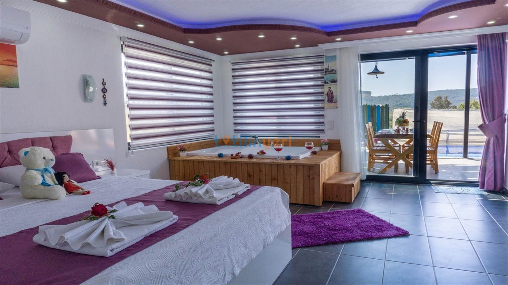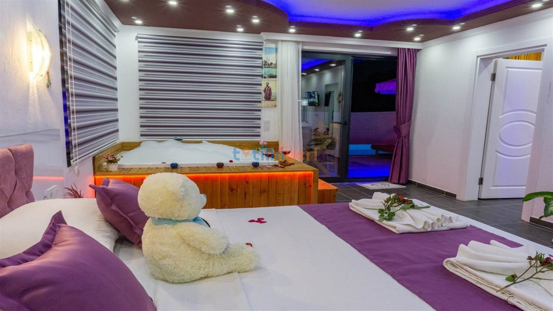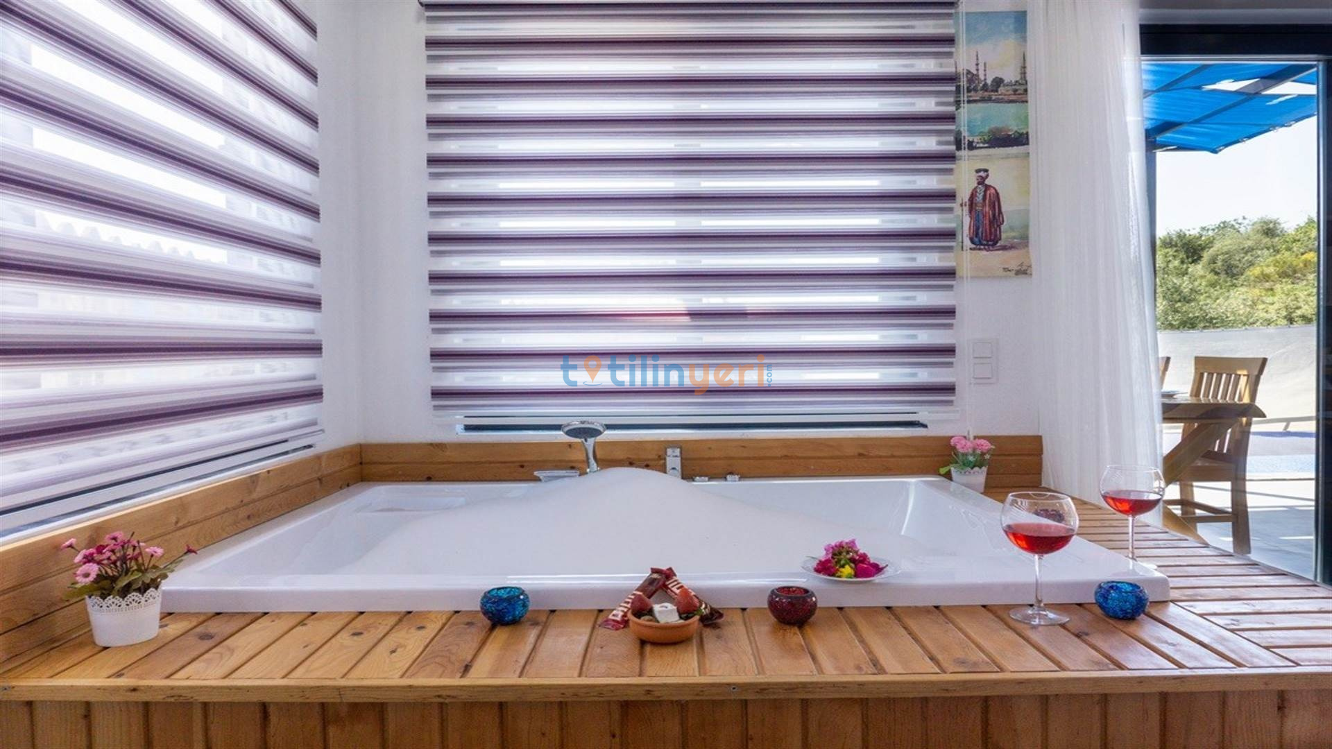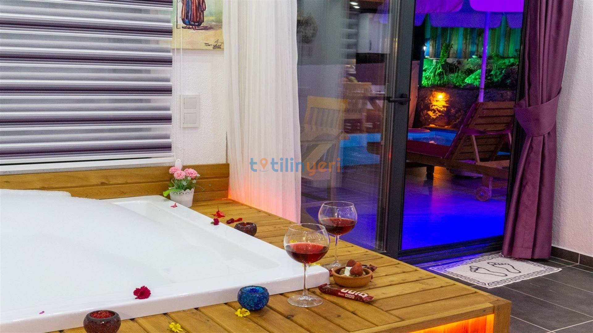 Özel havuzlu ve havuz alanı korunaklı villamız oldukça şirin bir dekorasyona sahiptir.Villamız özellikle balayı çiftlerine hitap etmekte ve villa içinde çiift kişilik jakuzi de yer almaktadır.