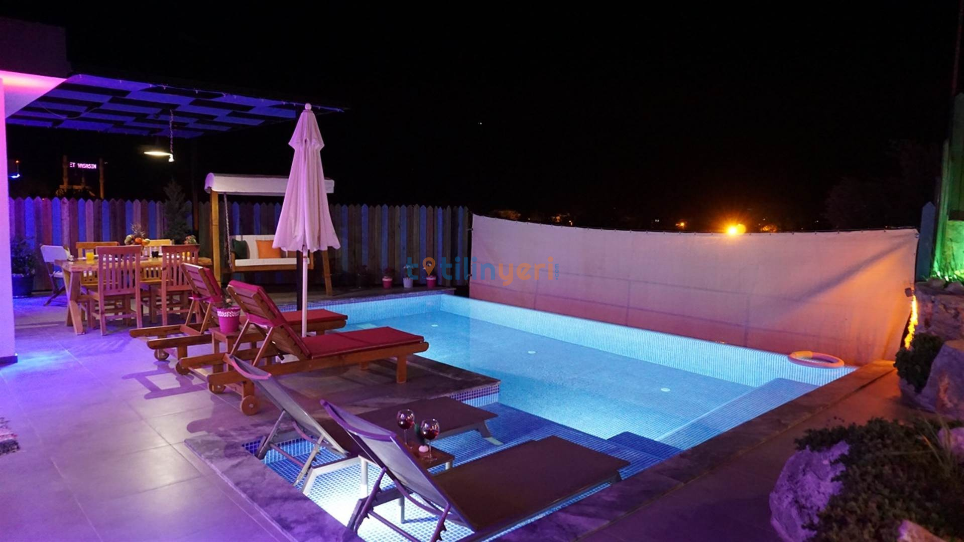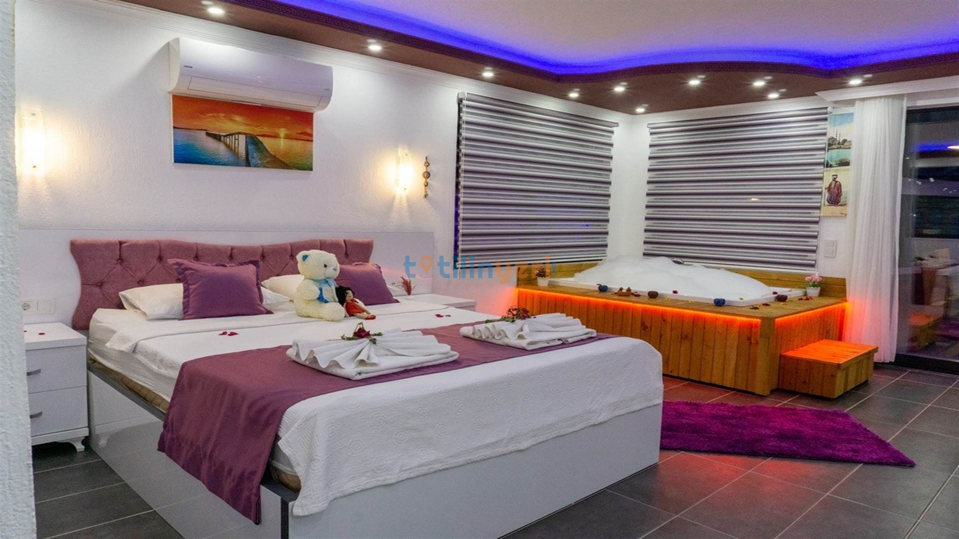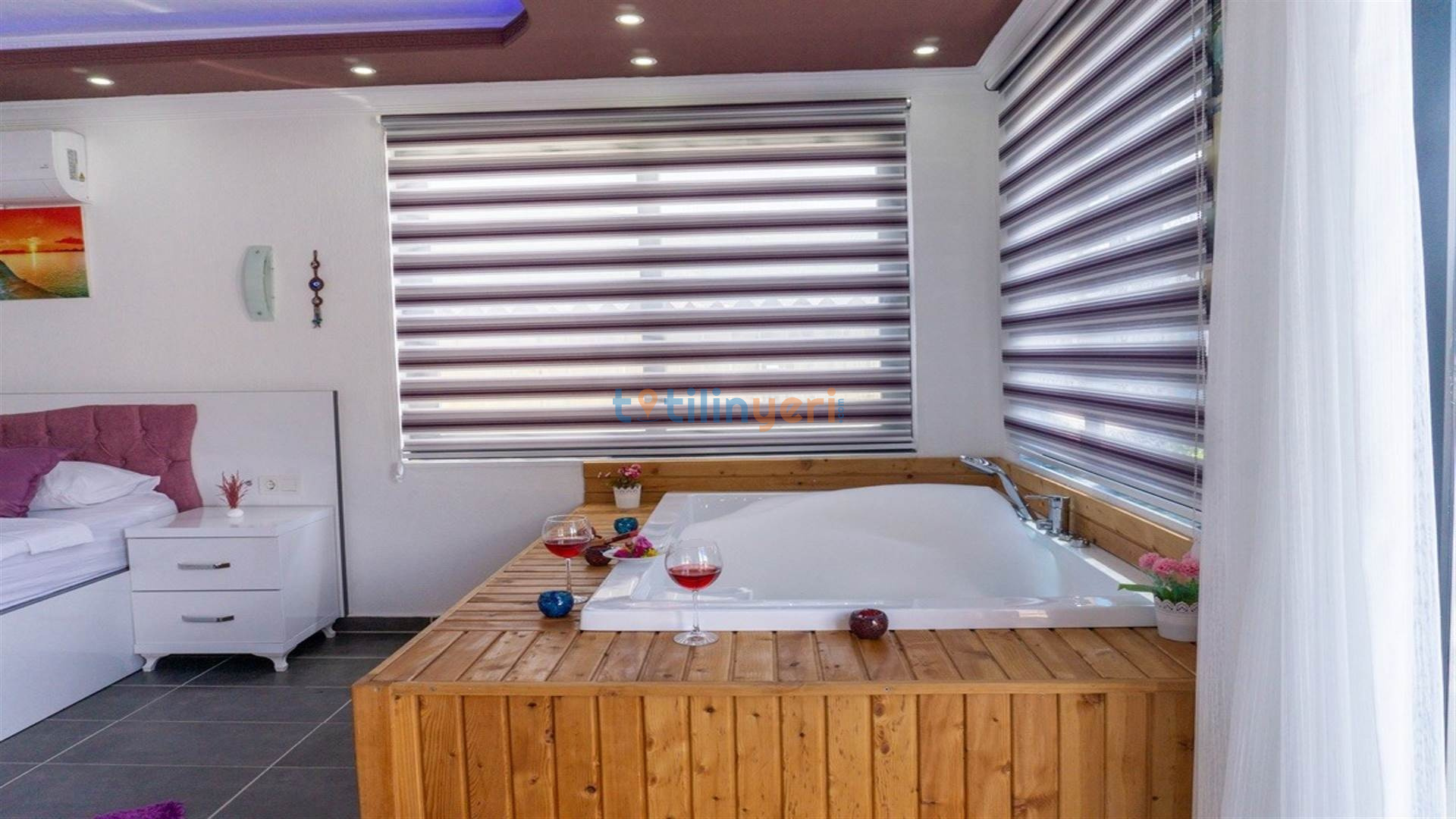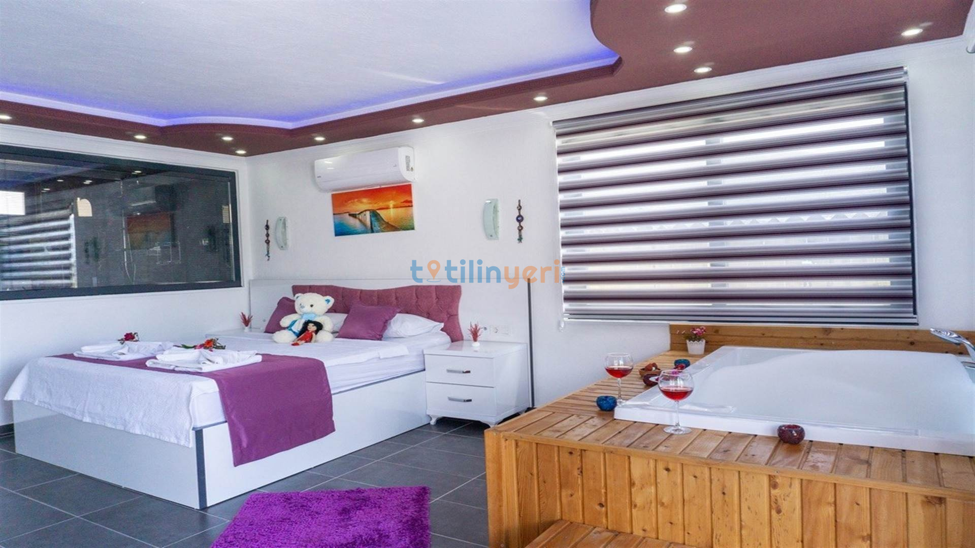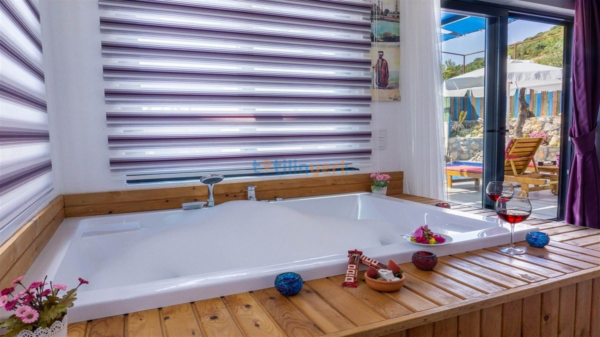 Özel havuzlu ve havuz alanı korunaklı villamız oldukça şirin bir dekorasyona sahiptir.Villamız özellikle balayı çiftlerine hitap etmekte ve villa içinde çiift kişilik jakuzi de yer almaktadır.