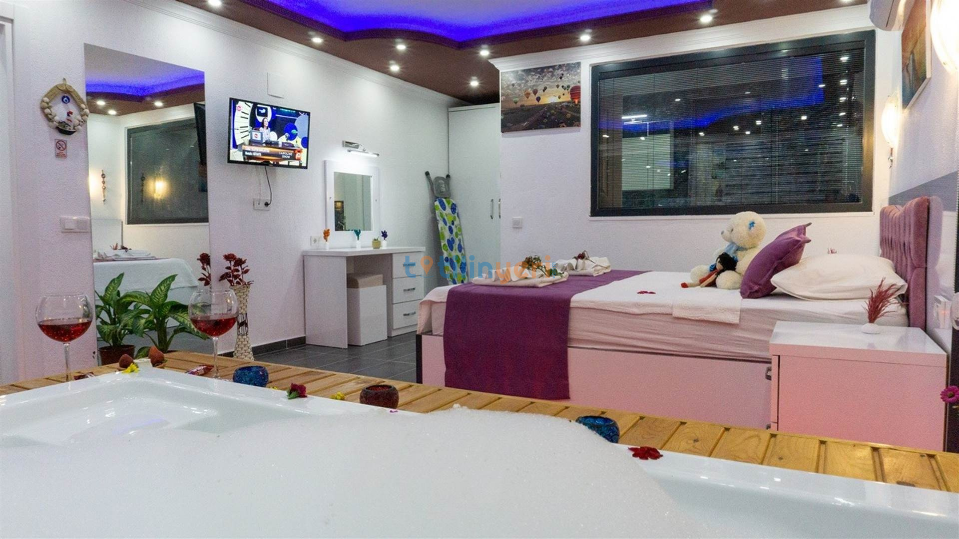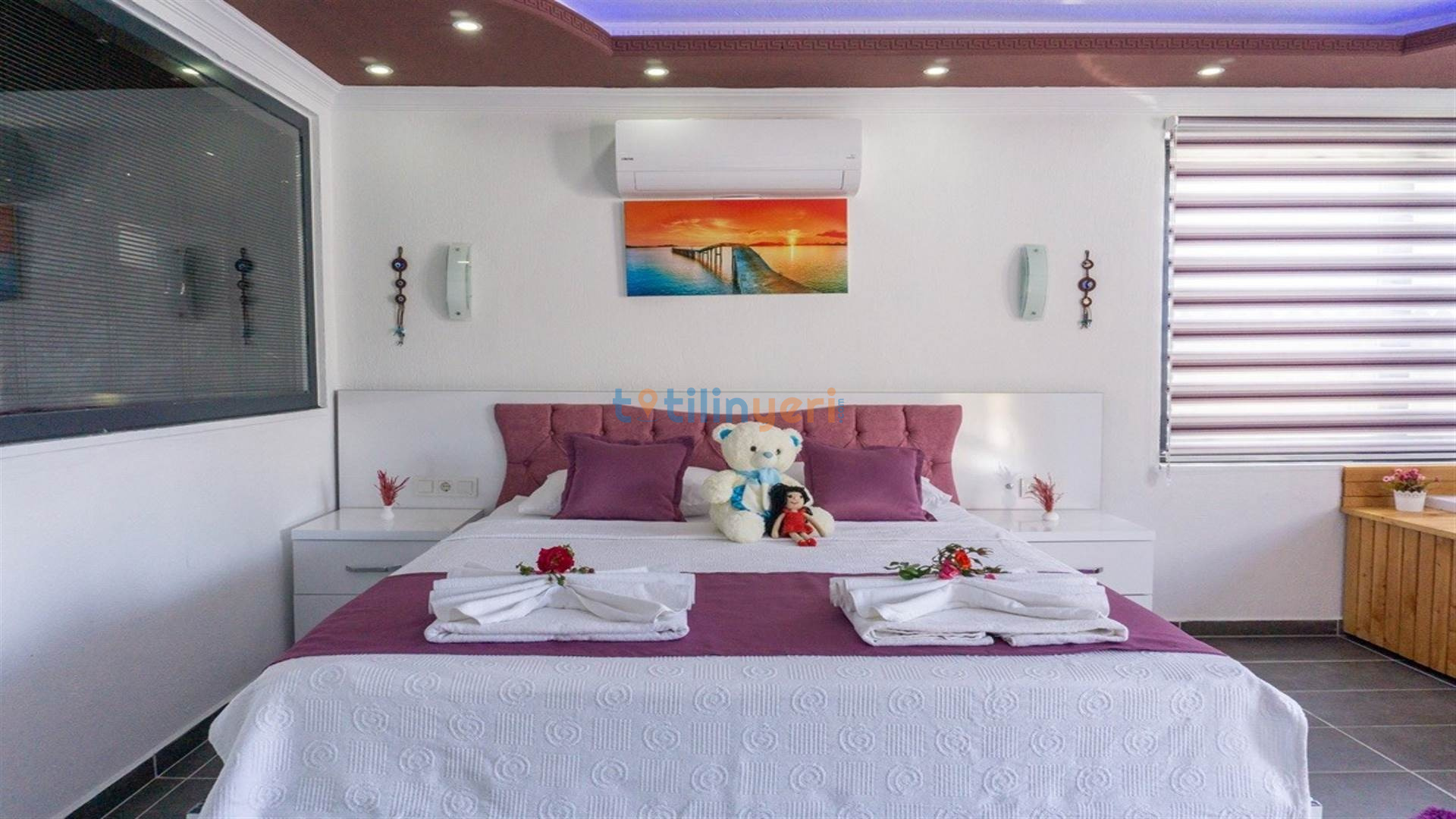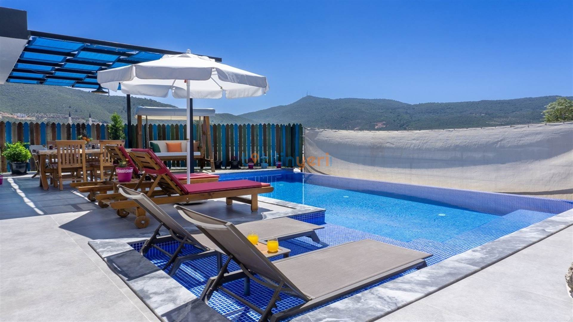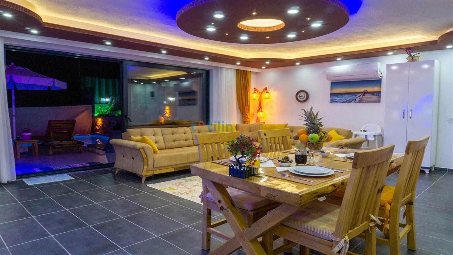 Özel havuzlu ve havuz alanı korunaklı villamız oldukça şirin bir dekorasyona sahiptir.Villamız özellikle balayı çiftlerine hitap etmekte ve villa içinde çiift kişilik jakuzi de yer almaktadır.